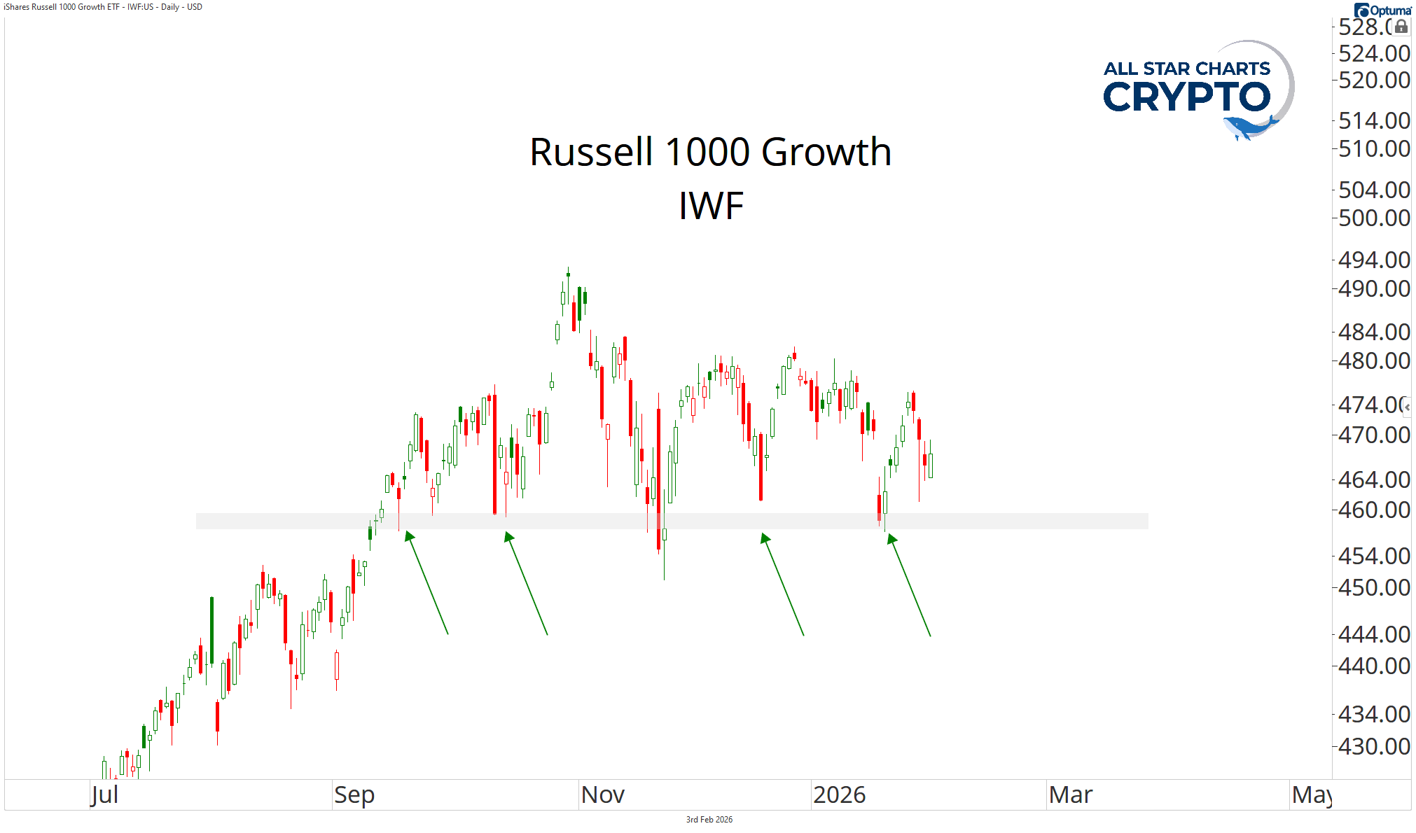 That said, when we look directly at IWF, the primary uptrend remains intact. Price continues to respect a key support zone, and that level will need to hold if the broader bull run is going to persist.
