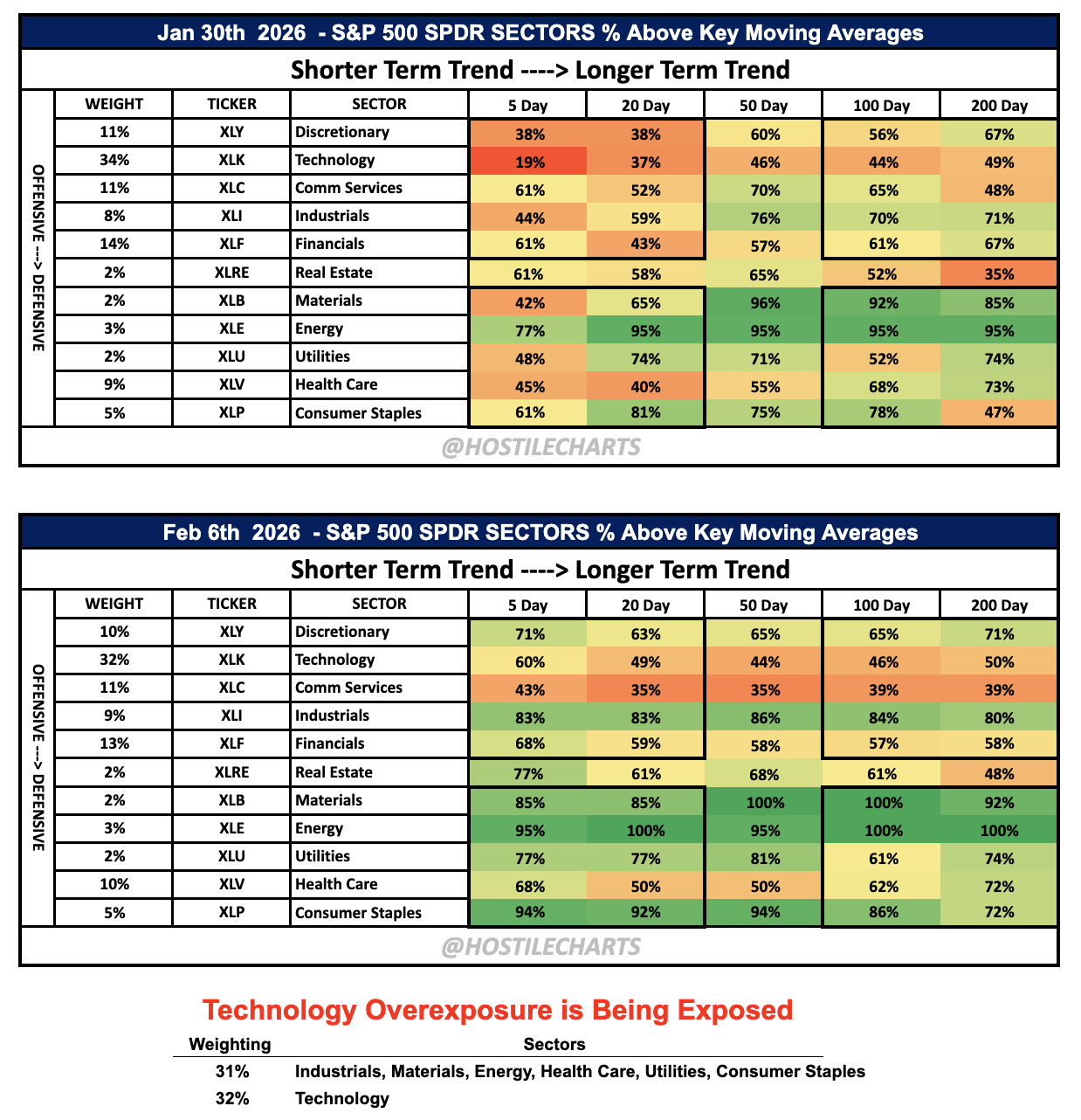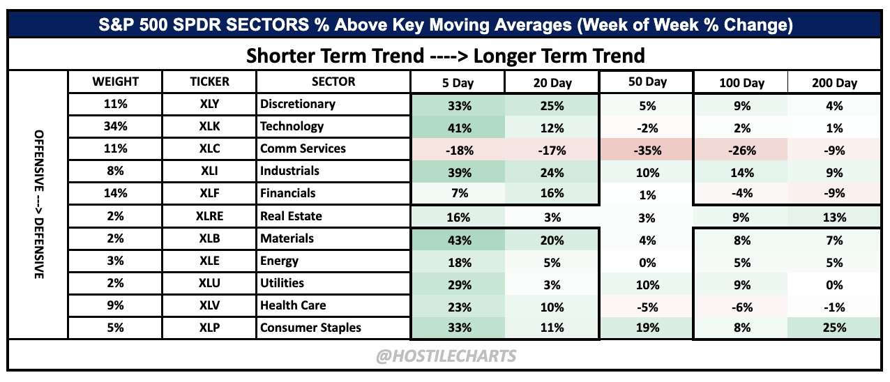 The shorter-term thrust is coming from everywhere except Technology, while longer-term trends remain intact across Industrials, Materials, Energy, Staples, Utilities, and Health Care.