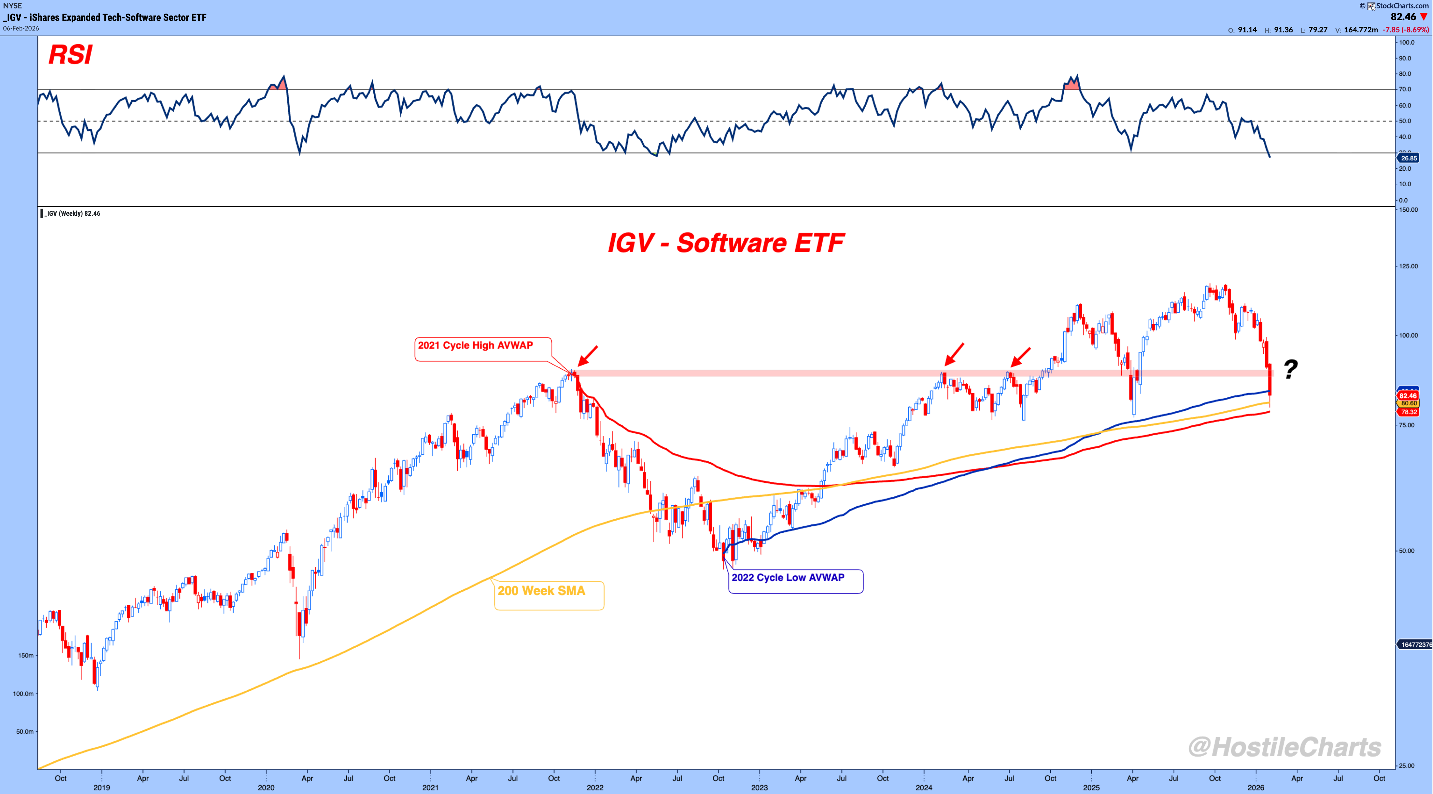 The ETF is coming directly into its 200-week SMA, with multiple AVWAPs clustering in the same zone.