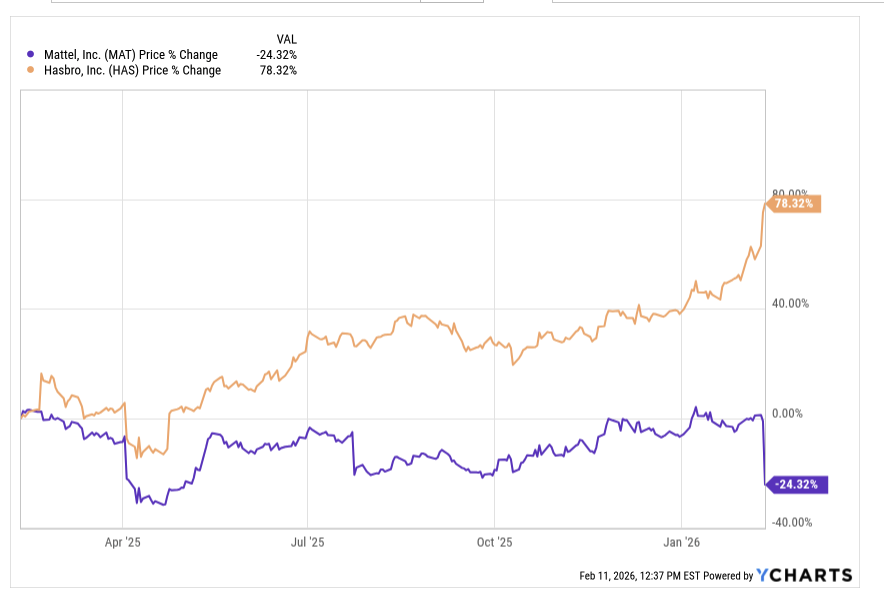 Mattel (The Warning): Mattel is only just beginning a $150 million digital pivot to buy back its mobile gaming joint venture. Analysts noted this investment is "seven years behind Hasbro," and with 2026 EPS guidance of $1.18–$1.30 (well below the $1.75 consensus), investors are treating Mattel as a legacy manufacturer rather than a modern IP powerhouse.