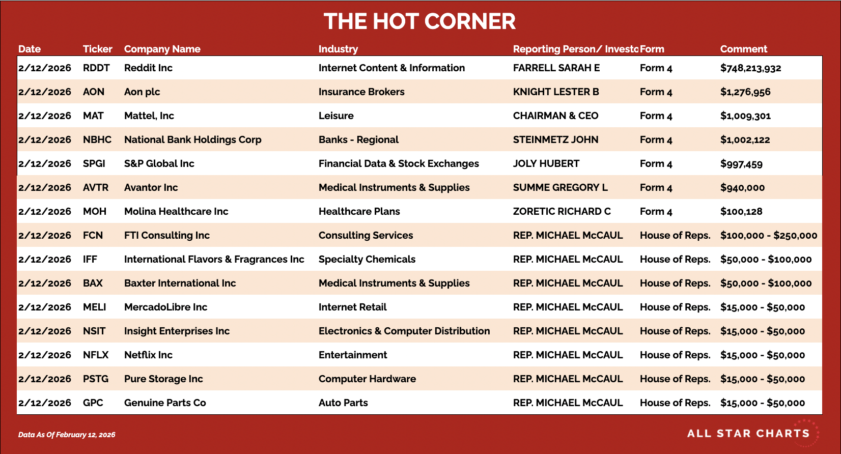 Hereβs The Hot Corner, with data from February 12, 2026: