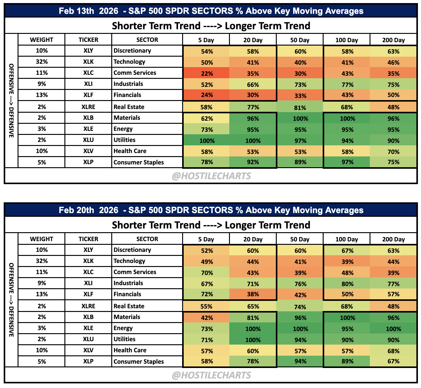 While Communication Services and Financials saw notable short-term improvement this week, that strength must expand into the 20 and 50-day columns to signal durable upside momentum.