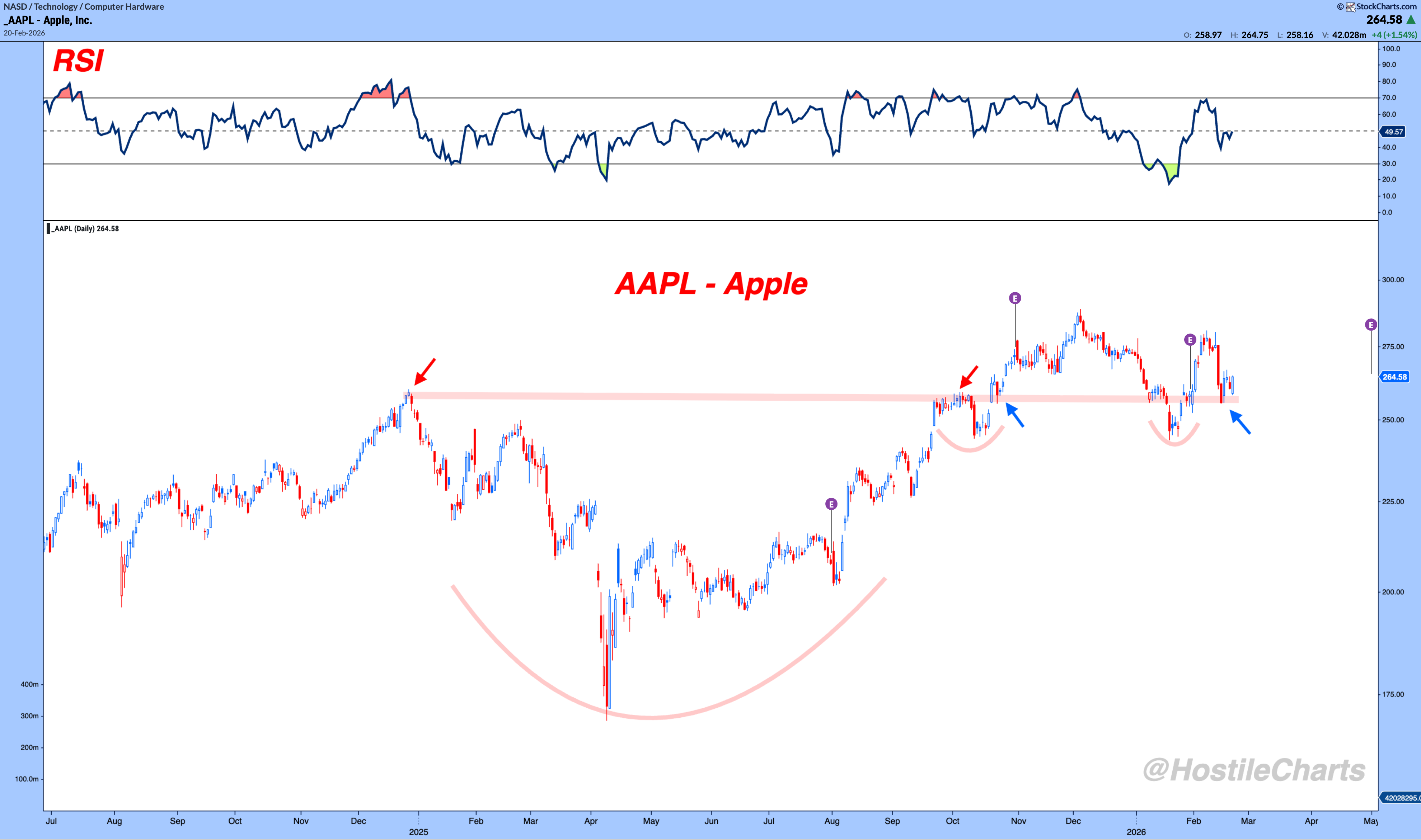 Financials are sitting at the bottom of a well-defined range near 52 to 53, with RSI struggling around 50 and price testing the 200-day area.