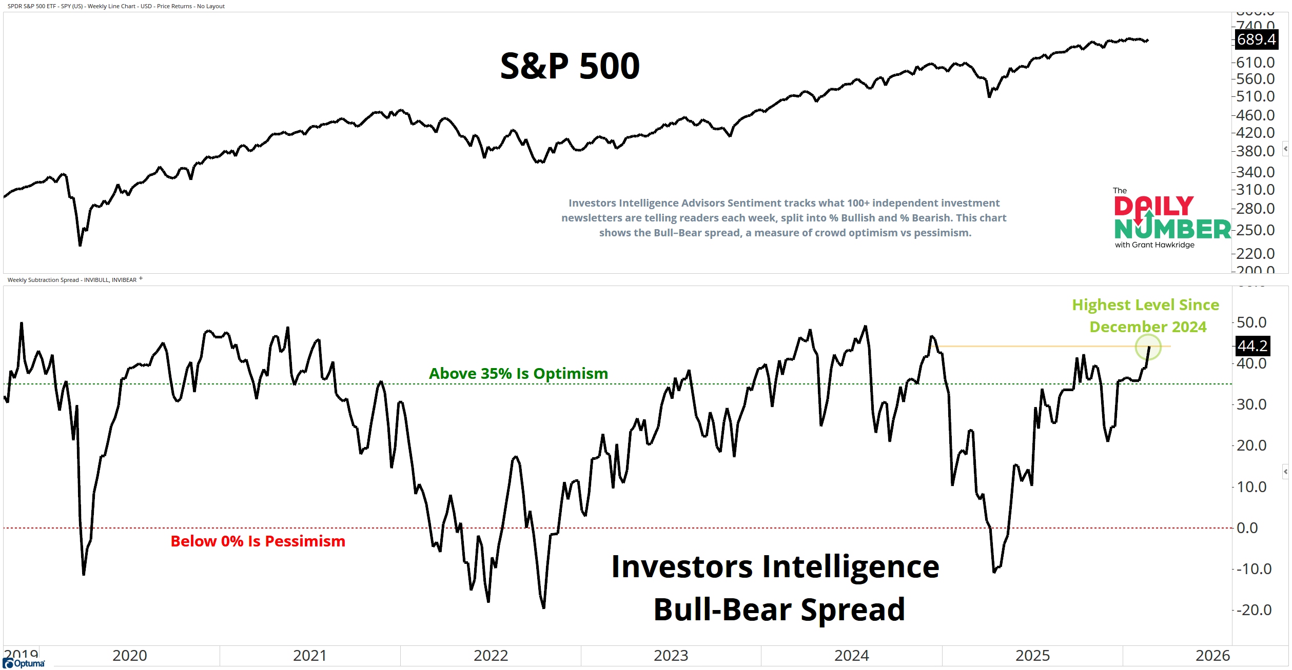 The Investors Intelligence Bull–Bear spread sits at 44.2%, its highest reading since December 2024.