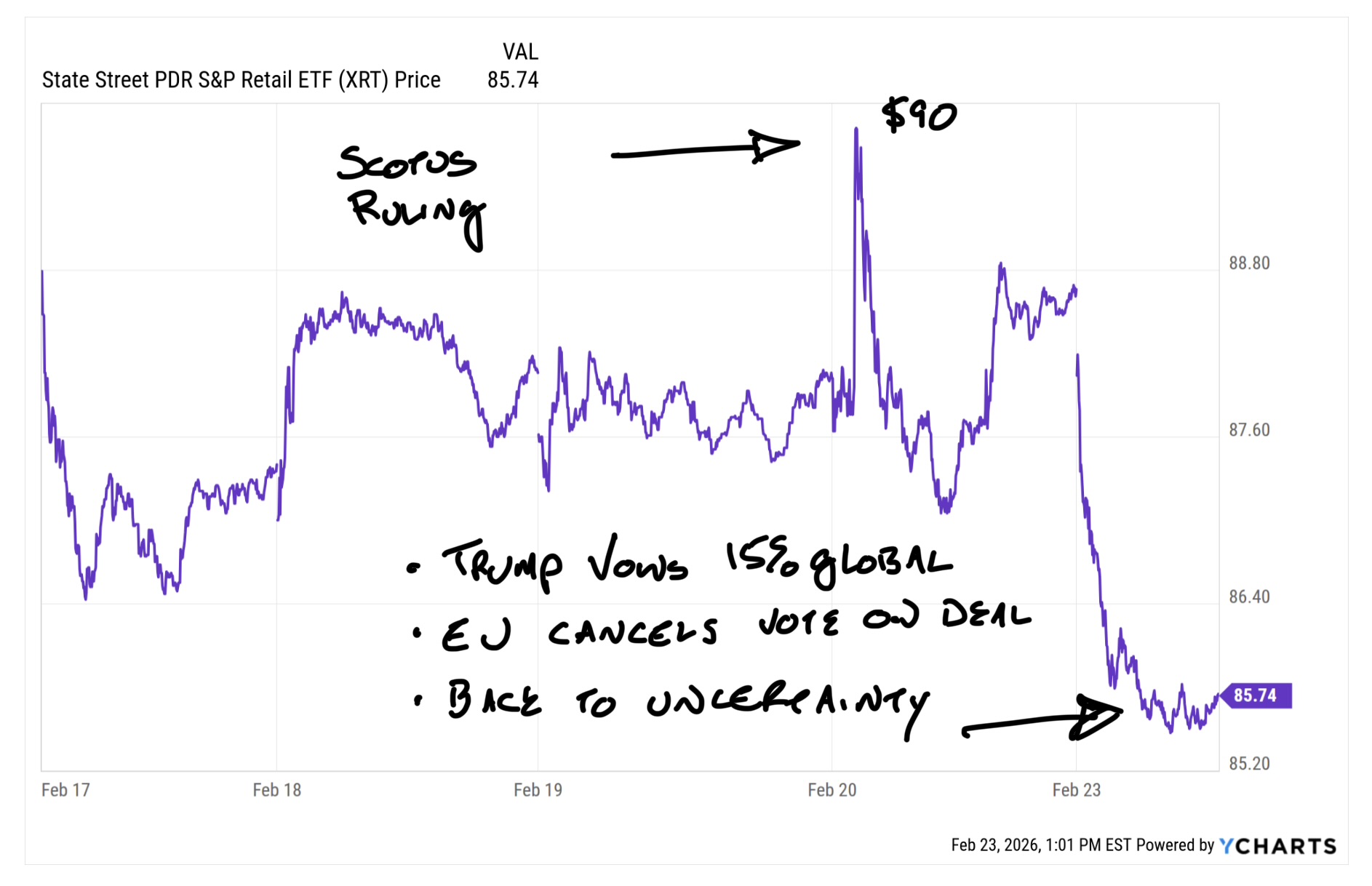 In part, the reaction was a function of a weak overall tape, as every sell-off tends to find a reason. Tariffs have been haunting consumer names, particularly in the discretionary space, for over a year, and markets famously "hate uncertainty". The President's predictable vow to fight the court's ruling with a 10% global tariff, which he then raised by 50% over the weekend, is just the type of thing that inspires investors to take some more off the table, which they have done all day today.