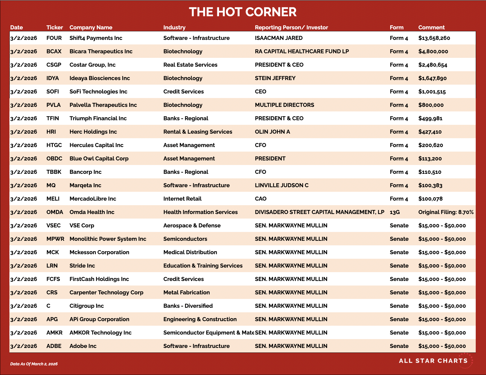 Hereβs The Hot Corner, with data from March 2, 2026: