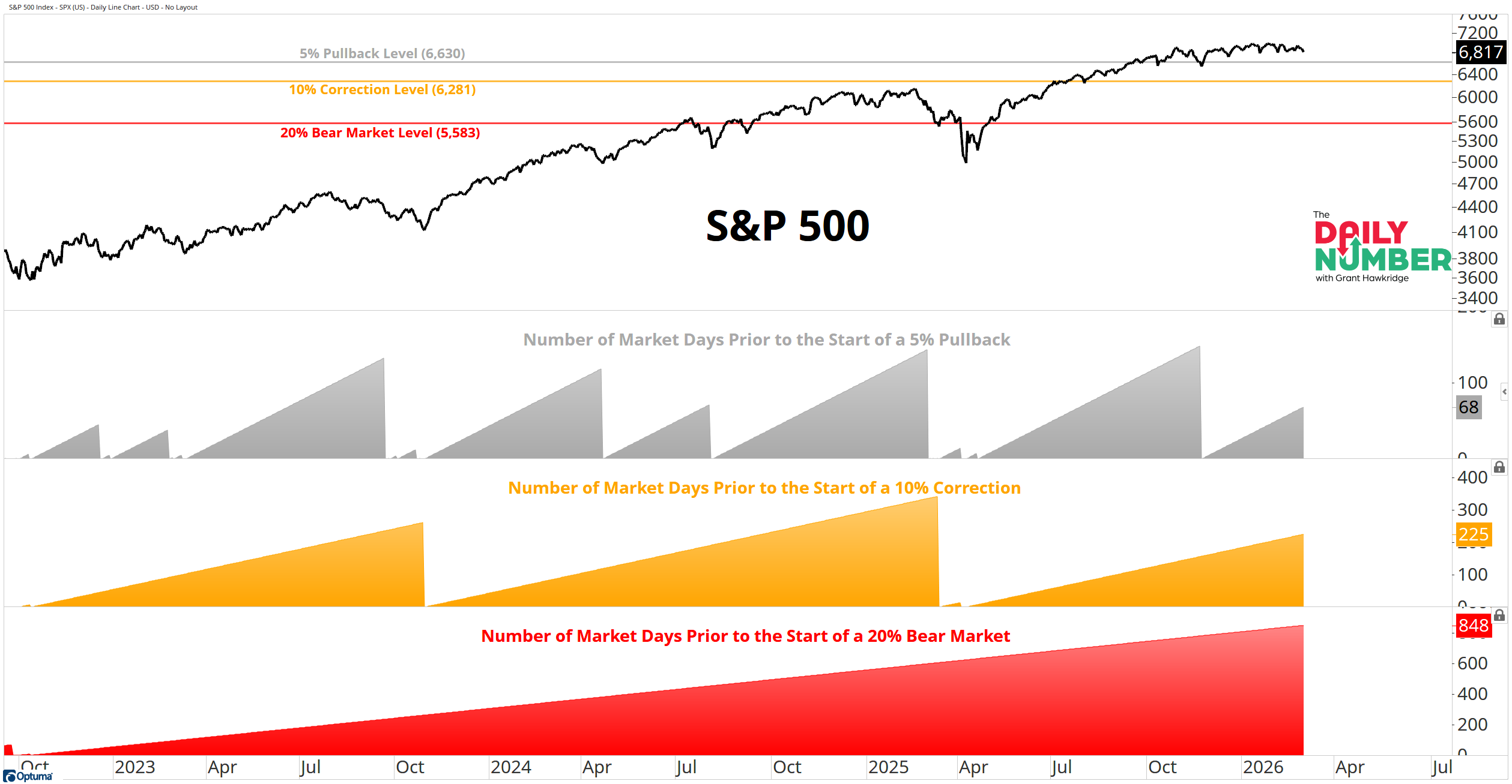 The middle section displays the number of market days prior to the start of a 5% pullback in grey.