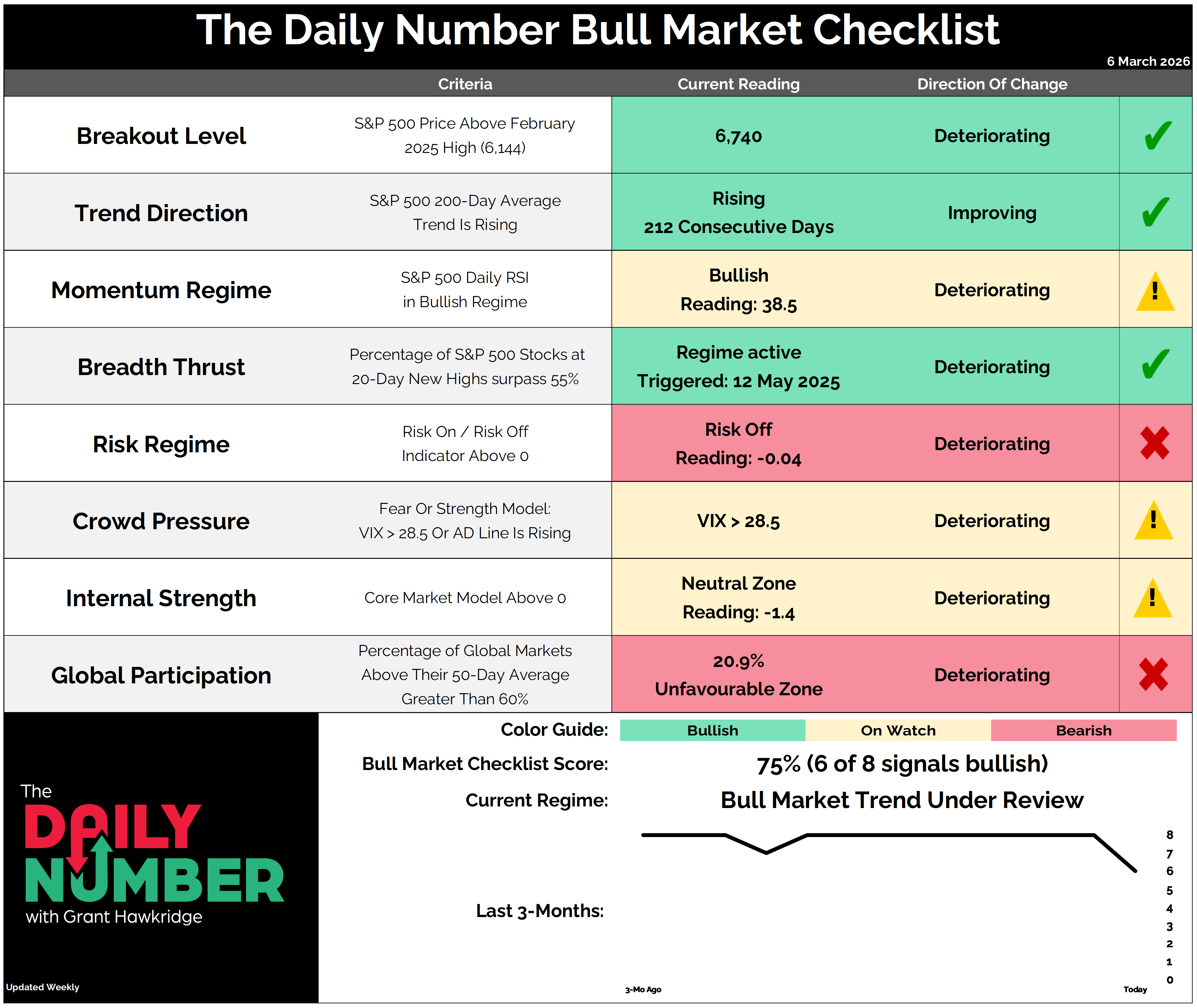Six of the eight signals in the Bull Market Checklist remain positive, but two have now flipped bearish as risk appetite and global participation deteriorate during the latest market price action.