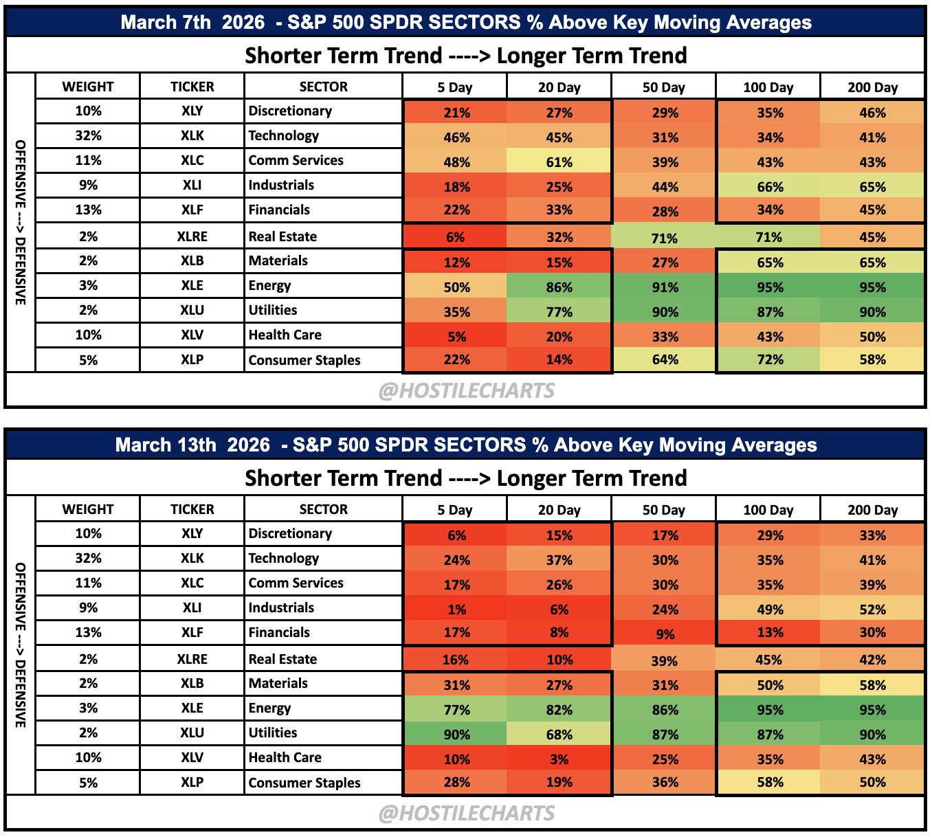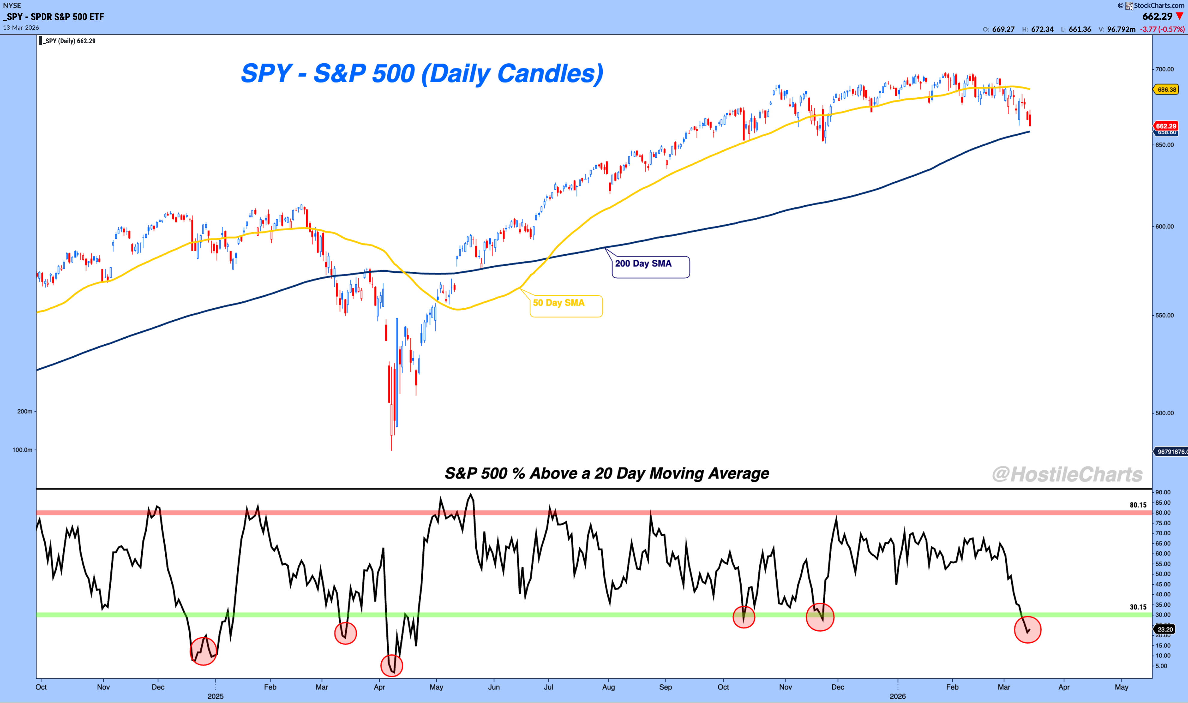 The Sunday Stalk List | Ep. 40 The Hopeful "Bounce" By Larry Thompson March 15, 2026 Welcome back to The Sunday Stalk List.Every weekend, I review hundreds if not thousands of charts across U.S. indices, global markets, breadth, sentiment, and intermarket relationships.And now I’m opening up my stalk list.The names that stood out the most from my review.This Week’s Theme: The Hopeful BounceTwo weeks ago the bears landed a clean punch.This week we saw the follow through.It’s a mess out there. The bulls aren’t on their heels.They’re on the canvas.Participation is weak, trends are breaking, and most charts simply aren’t in a position to lead. At this point the hopeful bounce is really the only thing the market has going for it right now.Price action certainly isn’t.Let’s get into it. Breadth - "The Market of Stocks"If you missed it, I broke down this dashboard and how I actually use it in my process during my weekly show. I know I sound like a broken record, but the message from breadth hasn’t changed. The market remains a mess.he one constructive takeaway is that breadth is now so washed out on the short-term measures that it has the potential to be good. We’re at the kind of levels where the bounce I mentioned earlier is what everyone is hoping for. And frankly, the market probably needs it. Without it, participation remains far too weak to support anything resembling a healthy advance. The Stalk List This week I’m only including one chart, but it captures a lot of what’s happening across the entire S&P 500. That’s one of the beauties of technical analysis. A few well-chosen tools can give you a pretty quick read on the market.SPY — S&P 500 with Trend & Breadth At the top we have the S&P 500 itself with the 50-day and 200-day moving averages, giving us the primary trend structure. Below it is the percentage of S&P 500 stocks above their 20-day moving average, which is a useful short-term breadth gauge.Right now that breadth measure has fallen to levels where we often see bounces. Historically when participation gets this washed out, markets tend to see some degree of mean reversion.But the key word there is reversion. Going down isn’t the reversion part. What we want to see is participation start expanding again.For me that means seeing this indicator reclaim the 30% level. A move back above that threshold would suggest a bounce could actually be getting underway. Until then, it’s mostly just hope.And hope alone won’t fix a market that’s currently on the ropes. It’s going to take broad participation.If we do see that bounce develop, the 200-day moving average on the S&P 500 becomes a very clean level to manage risk against. A bounce that holds that area would be constructive. Losing it would solidify that this market isn’t just taking a breather. It’s injured.Anyway, that's my two cents. My Methods Is A Messy Market If you’re struggling with this messy market, this week’s show was for you.I broke down three methods I use to navigate environments like this.If you missed it, throw it on 1.5x speed and let it rip. And if you enjoy it, hit the like button. It’s the easiest way to show some support.Much love. Thompson's Two Cents Larry Thompson delivers timeless trading lessons and market wisdom in quick daily notes. More from Thompson's Two Cents Larry Thompson Methods For A Messy Market Honesty Matters.... March 12, 2026 Larry Thompson It's Messy That's Ok March 10, 2026 Larry Thompson The Sunday Stalk List | Ep. 39 The Bears Landed A Clean Punch March 8, 2026 Trade Smarter With Larry’s TakeThompson’s Two Cents offers concise market wisdom, timeless trading lessons, and chart-driven perspective you can trust. You must have JavaScript enabled to use this form. Email More from Thompson's Two Cents Thompson's Two Cents Watch Now