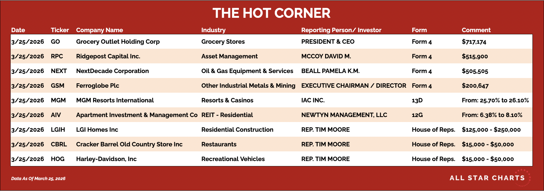 Hereβs The Hot Corner, with data from March 25, 2026: