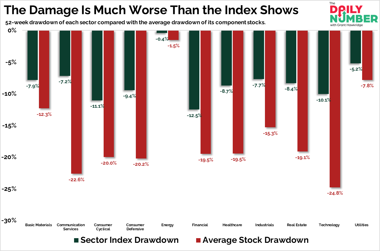 The Takeaway: The average stock is falling much more than the sector indexes. This gap appears in every sector on this chart.