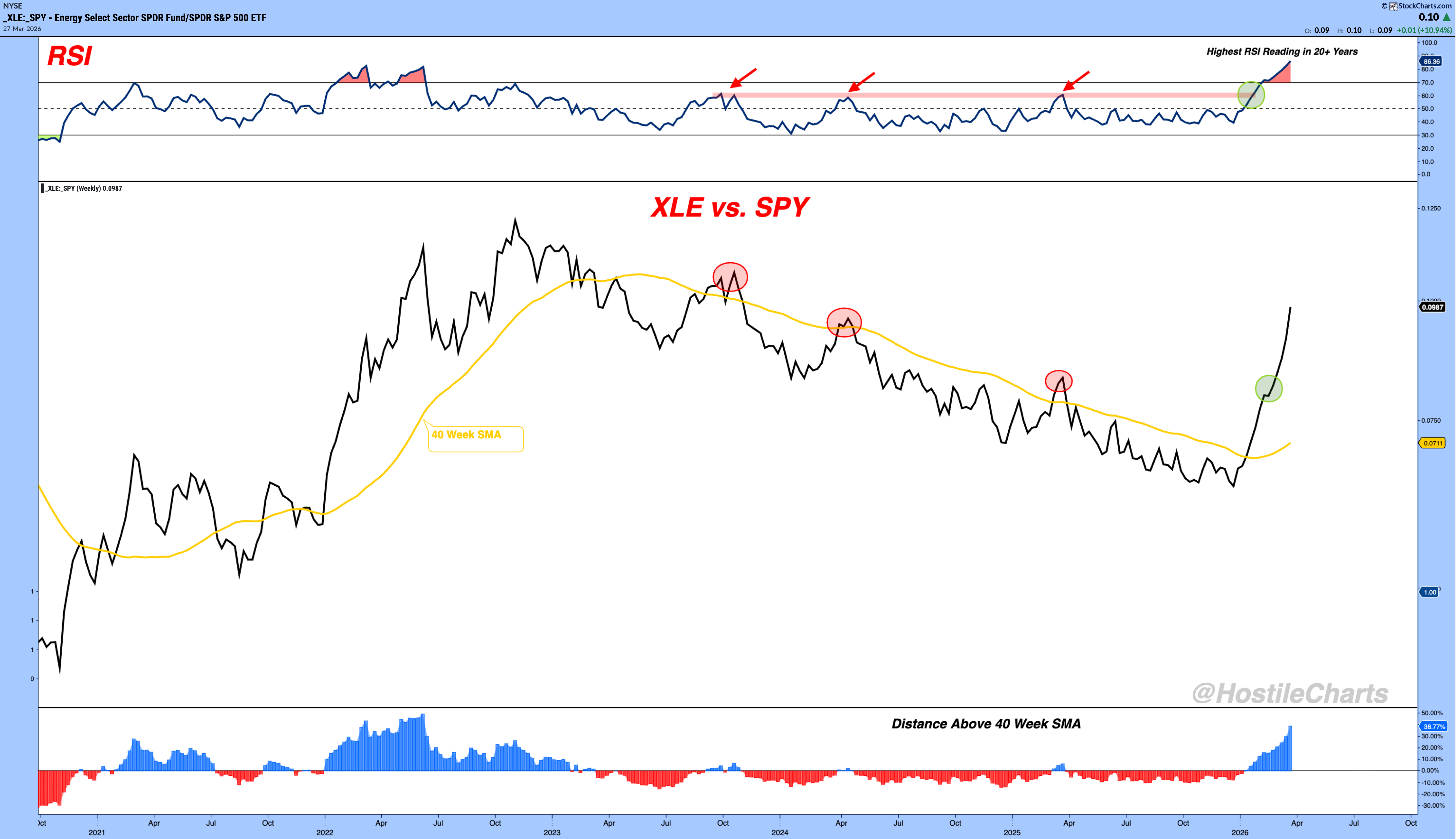 The XLE vs. SPY ratio is breaking out, and the RSI on that ratio is at its highest level in over 20 years.