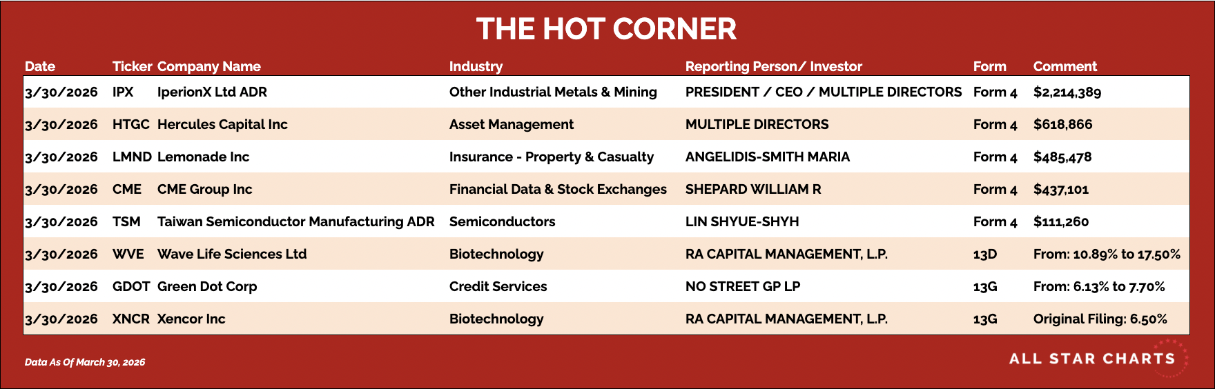Hereβs The Hot Corner, with data from March 30, 2026: