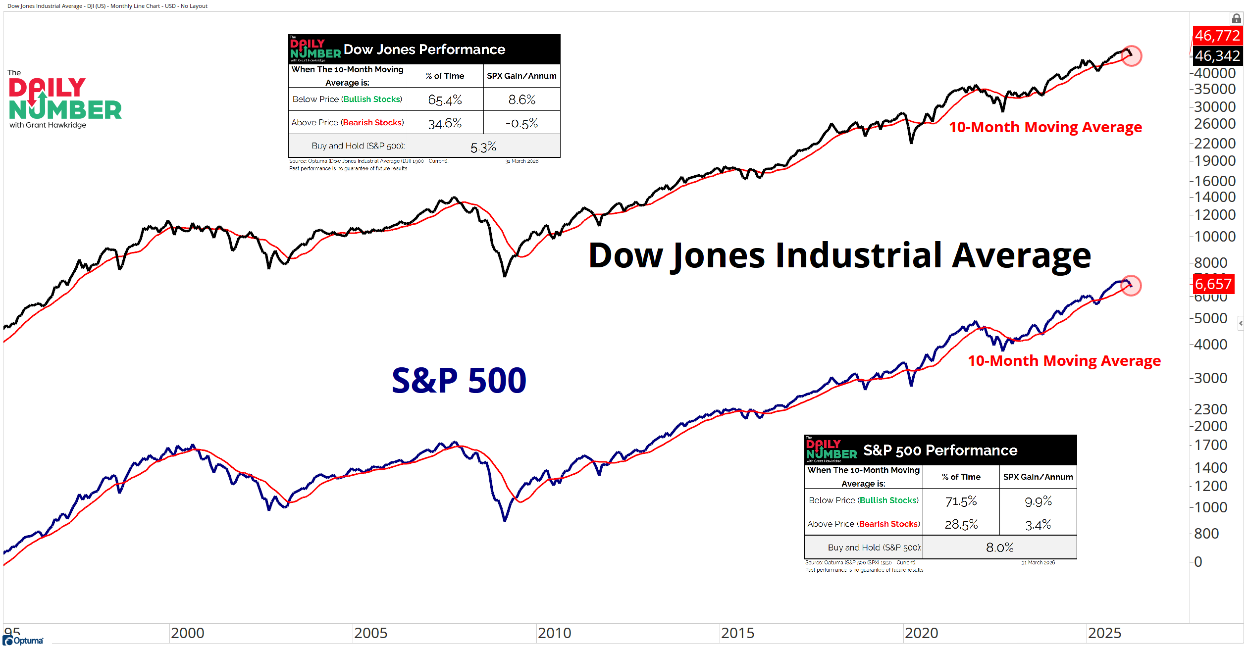 Multiple indices breaking the same level raises the stakes. The Dow, S&P 500, and Nasdaq 100 all closed below the 10-month trend. That shift pushes the market from the higher-return regime into the lower-return one.
