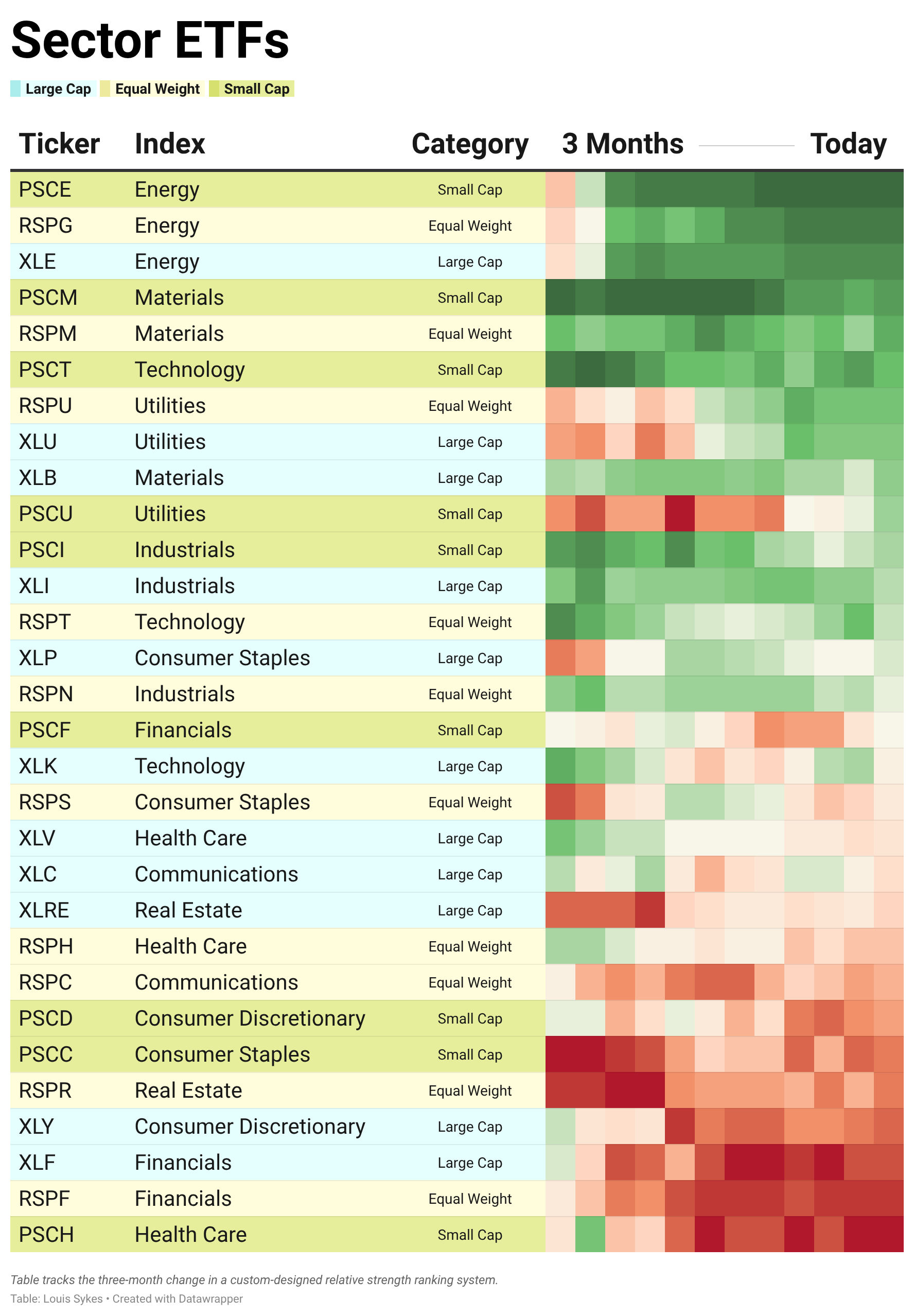Unsurprisingly, energy is still the leader on our sector table this week. Most sectors have been trending lower, while financials and technology have completed major downside breakdowns.