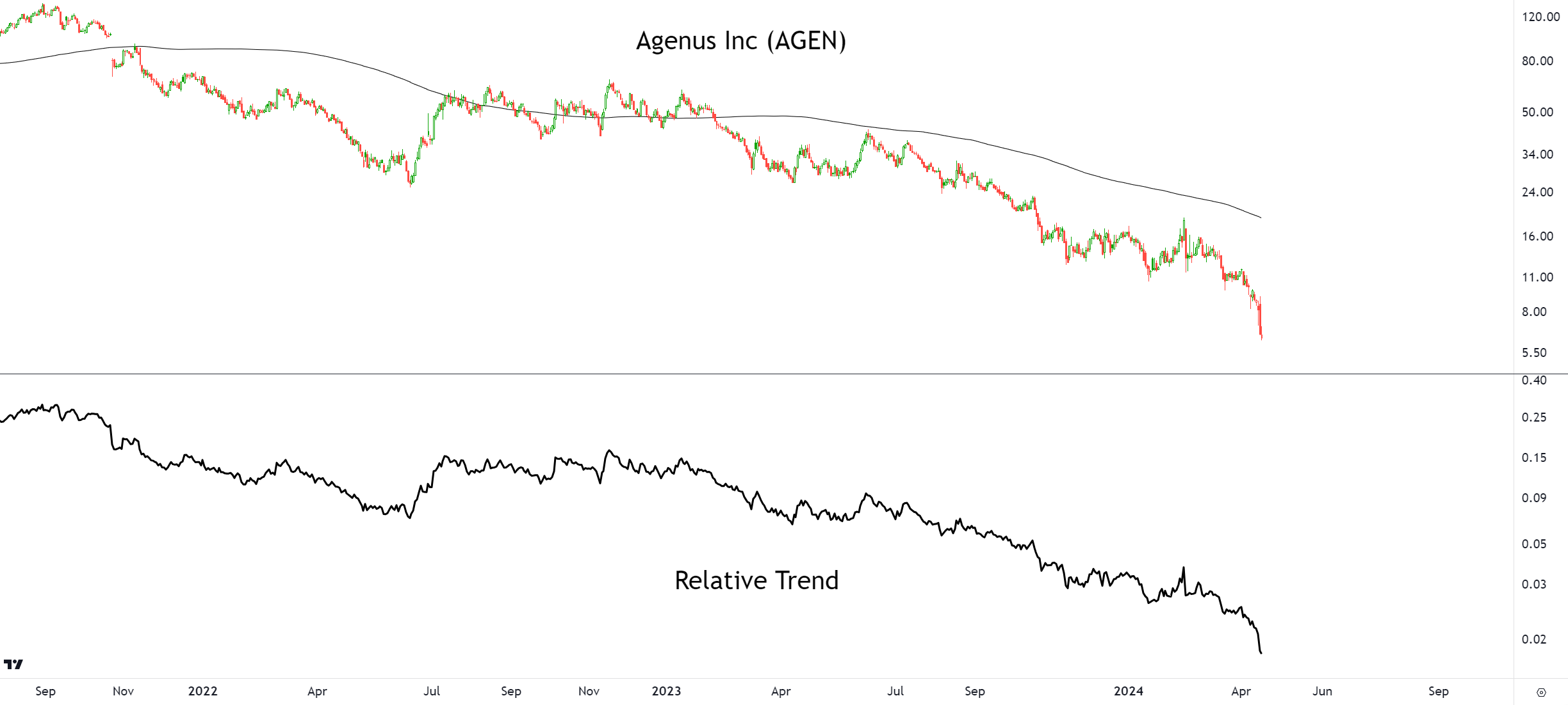 From a technical analysis perspective, the stock of Agenus Inc is currently trending lower. The stock price has been consistently moving downwards, forming lower highs and lower lows. This indicates a bearish trend and suggests that selling pressure outweighs buying interest in the market.