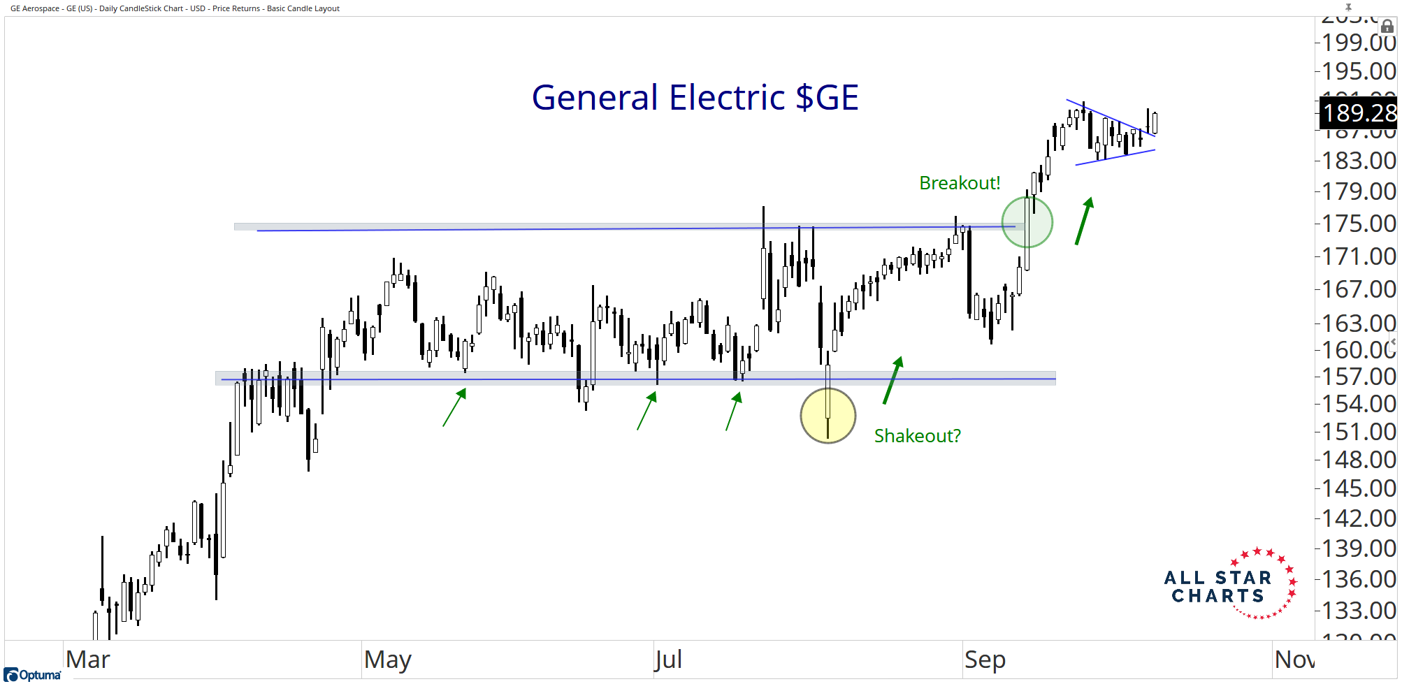 This wasn’t a downside resolution. GE immediately recovered and was back at the upper bounds of the range a couple of weeks later. It eventually went on to resolve higher.