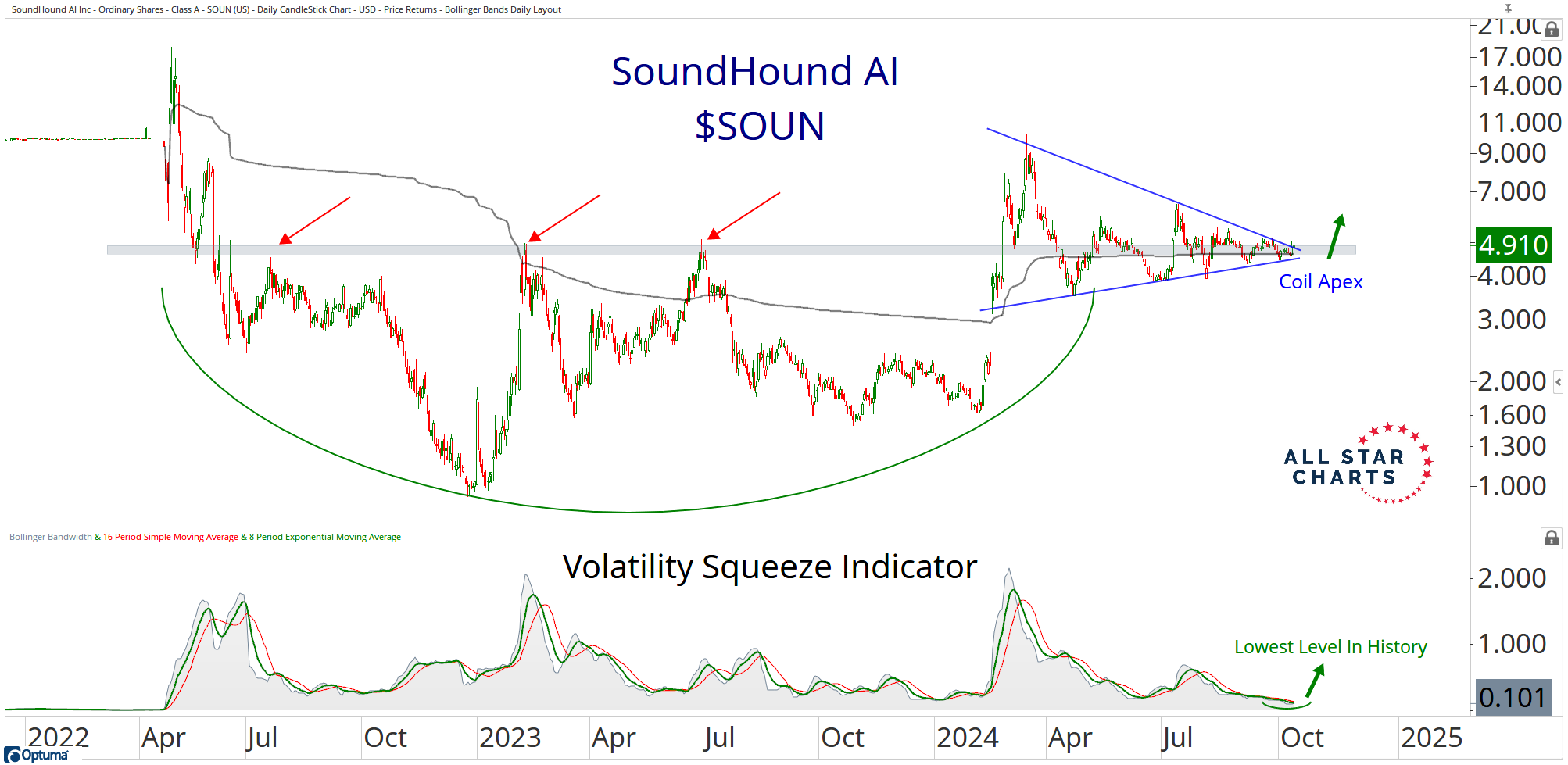 Breakout Multiplier We Didn’t Buy Enough Time! By Steve Strazza October 14, 2024 This post was originally for paid members only. It has since been unlocked for informational purposes and does not constitute financial advice. If you're not a member, sign up here.On last week’s call, we discussed putting a new trade on SoundHound AI $SOUN as our current calls are really running out of time.We still love the setup. It’s the same exact situation as when we put the initial trade on two months ago, but better. This coil is truly at the apex of its range. A resolution is imminent. Let’s make sure we have the right exposure for it. Price is currently sitting around the base breakout zone that coincides with the VWAP from the IPO.Our volatility squeeze indicator is at the most compressed level in the stock’s history.Some upside momentum has come into the name over the past few sessions, and it’s starting this week off with yet another follow-through candle.Here's the play:We’re buying the $SOUN 1/17/25 $7 calls for approximately $0.30 per contract. More from Breakout Multiplier Steve Strazza Breakout Book - Weekly Review (11/9/2025) November 9, 2025 Steve Strazza Betting on Charles November 7, 2025 Steve Strazza Energy Up, Rocket Down November 6, 2025