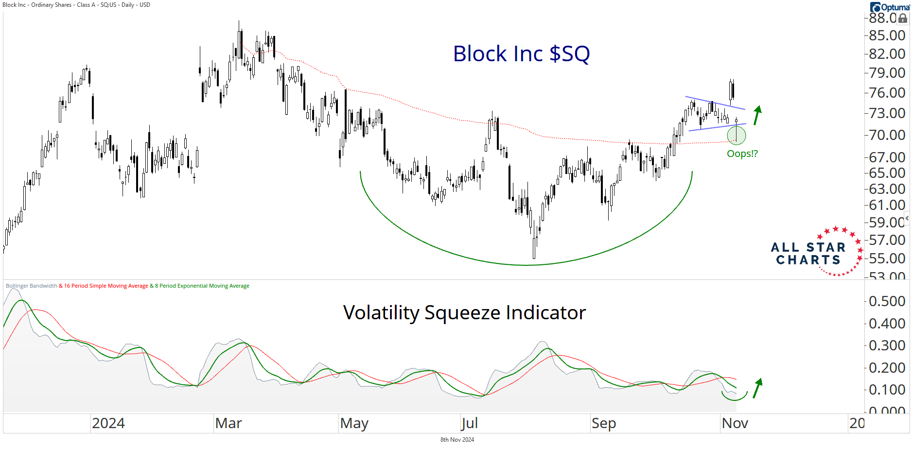 Breakout Multiplier Sell the Double, Buy the Block By Steve Strazza November 8, 2024 This post was originally for paid members only. It has since been unlocked for informational purposes and does not constitute financial advice. If you're not a member, sign up here.The stock market is embarking on a fresh leg higher, supported by the broadest participation we've seen this cycle.With speculative growth stocks on fire, our $ARKK 11/15 $52 calls are doubling today. We want to take half off the table here and redeploy that capital into a new position. I’m selling them for $1.80.The initial earnings reaction for $SQ is catching our attention today. The stock plunged lower but has been clawing back losses all morning.Just look at the wick forming on todays daily candle: Following a false breakout this week, SQ is ripping off its VWAP from the March high and refusing to break lower from this coil. This is the kind of post-earnings shakeout we want to buy all day. This stock is a part of the speculative growth theme and looks quite similar to ARKK, but is offering a far more favorable entry. If we’re above 71, SQ is probably resolving this pennant higher. With our volatility indicator coming off an extreme low and a double false start from this coil, we think a resolution and reaction rally is imminent. I’m buying the $SQ 12/20 $77.5 calls for approximately $1.80 per contract Steve More from Breakout Multiplier Steve Strazza Betting on Charles November 7, 2025 Steve Strazza Energy Up, Rocket Down November 6, 2025 Steve Strazza Breakout Multiplier Weekly Strategy Session - November 6, 2025 November 6, 2025