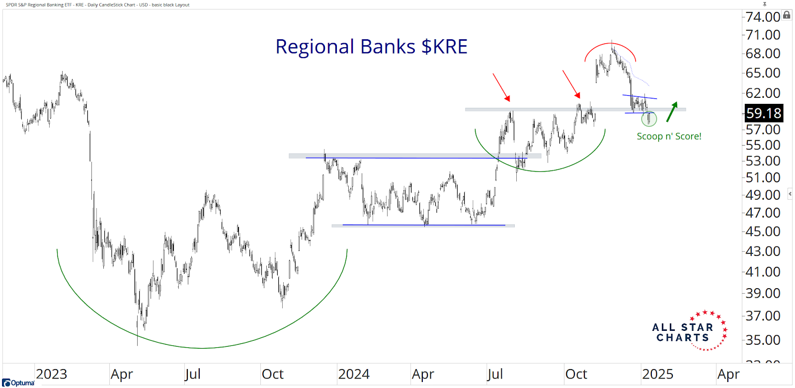 This week, we saw a lot of breakdowns failing, and shaking traders out before ripping higher. We jumped on the opportunity and put a new trade on the Regional Banks ETF $KRE.