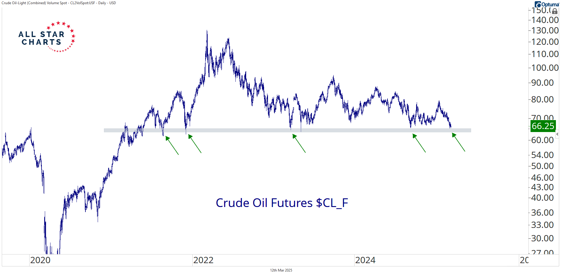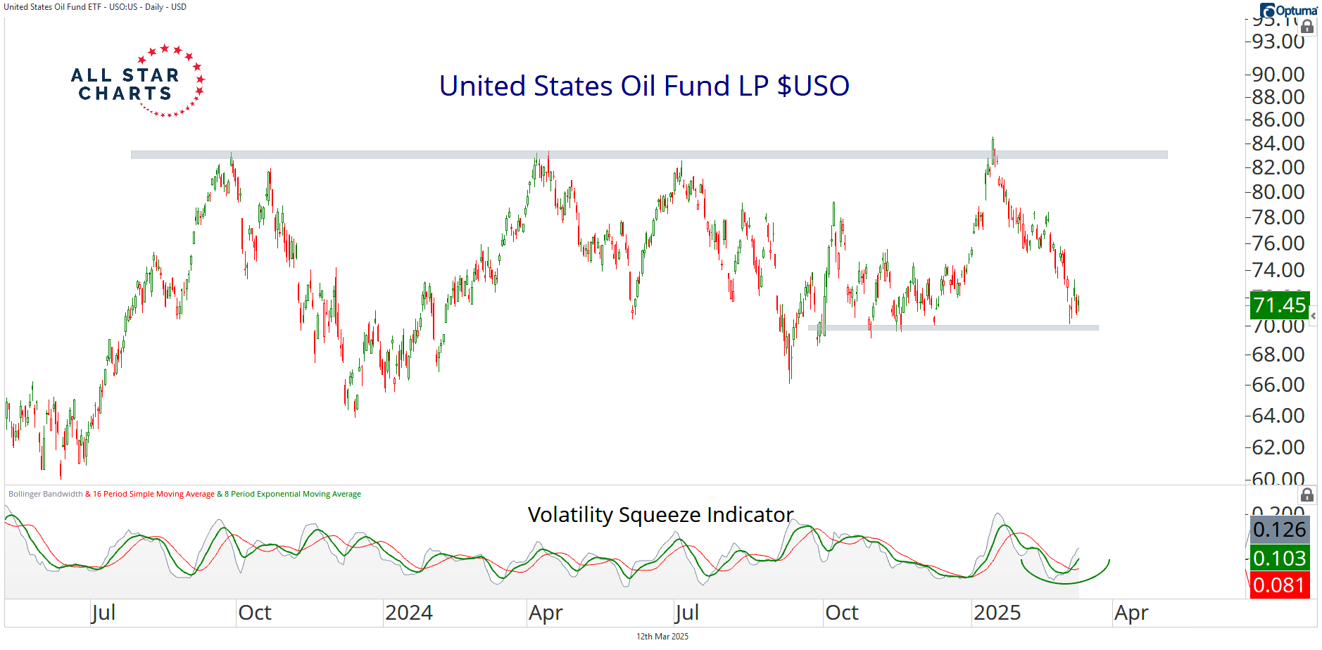 Breakout Multiplier Buying Oil For a Rebound By Steve Strazza March 12, 2025 This post was originally for paid members only. It has since been unlocked for informational purposes and does not constitute financial advice.If you're not a member, sign up here.Crude oil has been trading in lock-step with the US Dollar Index all cycle. And believe it or not, the dollar has been hit even harder than the stock market lately. DXY is down about 7% in two months.I want to bet on an oversold bounce in US dollars, and I don’t think there is a better way to do it than getting long oil.Here’s crude oil futures catching a bid at the lower bounds of a multi-year range: And here’s our vehicle, the United States Oil Fund $USO: Notice our volatility squeeze indicator crossing up in the bottom pane.I think we’re in for a killer rebound rally. I’m more interested in a quick double in this market than a big winner. This setup is perfect for it.We’re buying the $USO 4/17 $76 calls for approximately $1.00-1.20 per contract.Steve More from Breakout Multiplier Steve Strazza Betting on Charles November 7, 2025 Steve Strazza Energy Up, Rocket Down November 6, 2025 Steve Strazza Breakout Multiplier Weekly Strategy Session - November 6, 2025 November 6, 2025