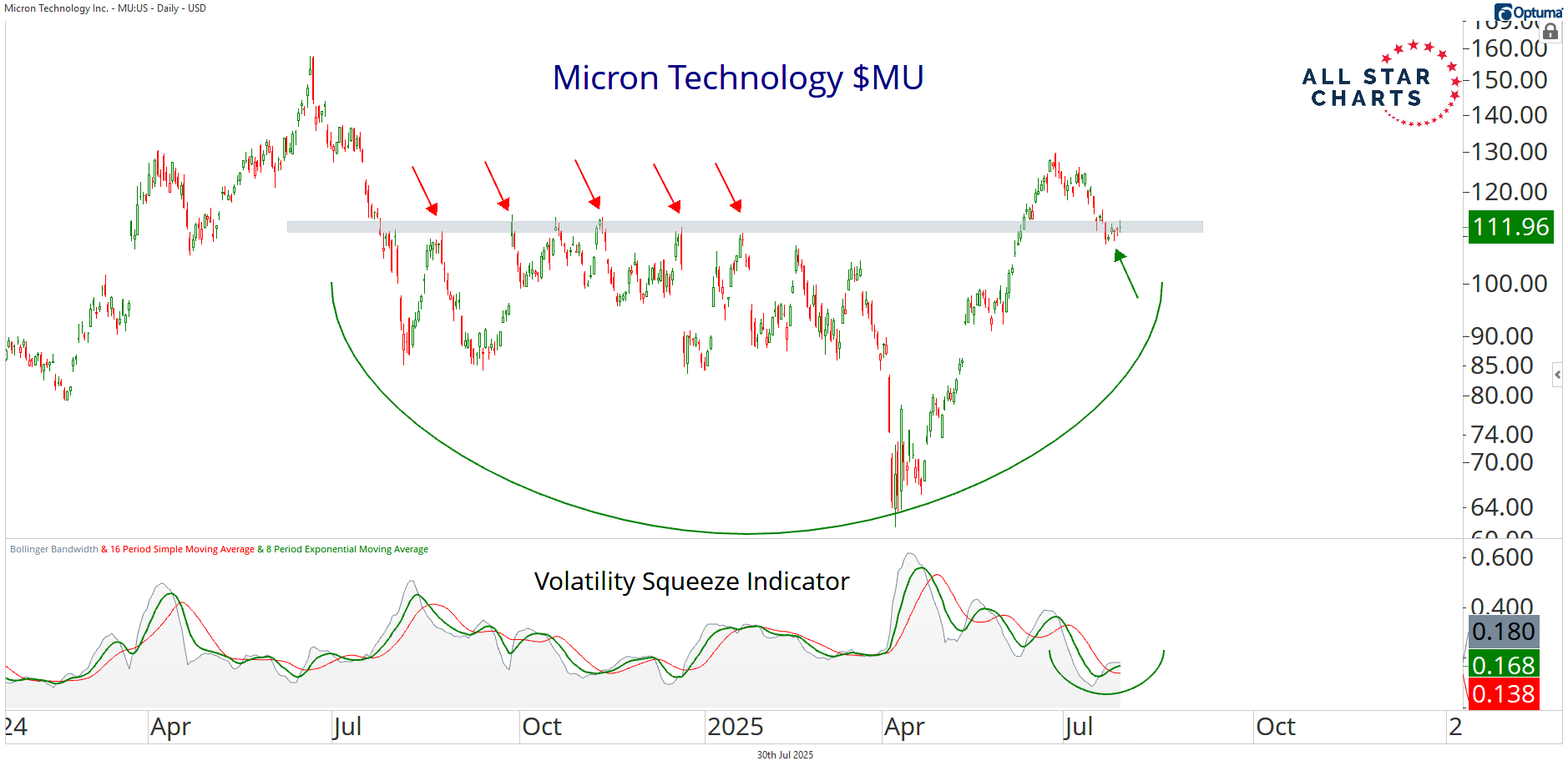 Our volatility squeeze indicator has moved from an expansion extreme to a compression extreme over the past few months. A big move is brewing, and we’re betting it will be higher.