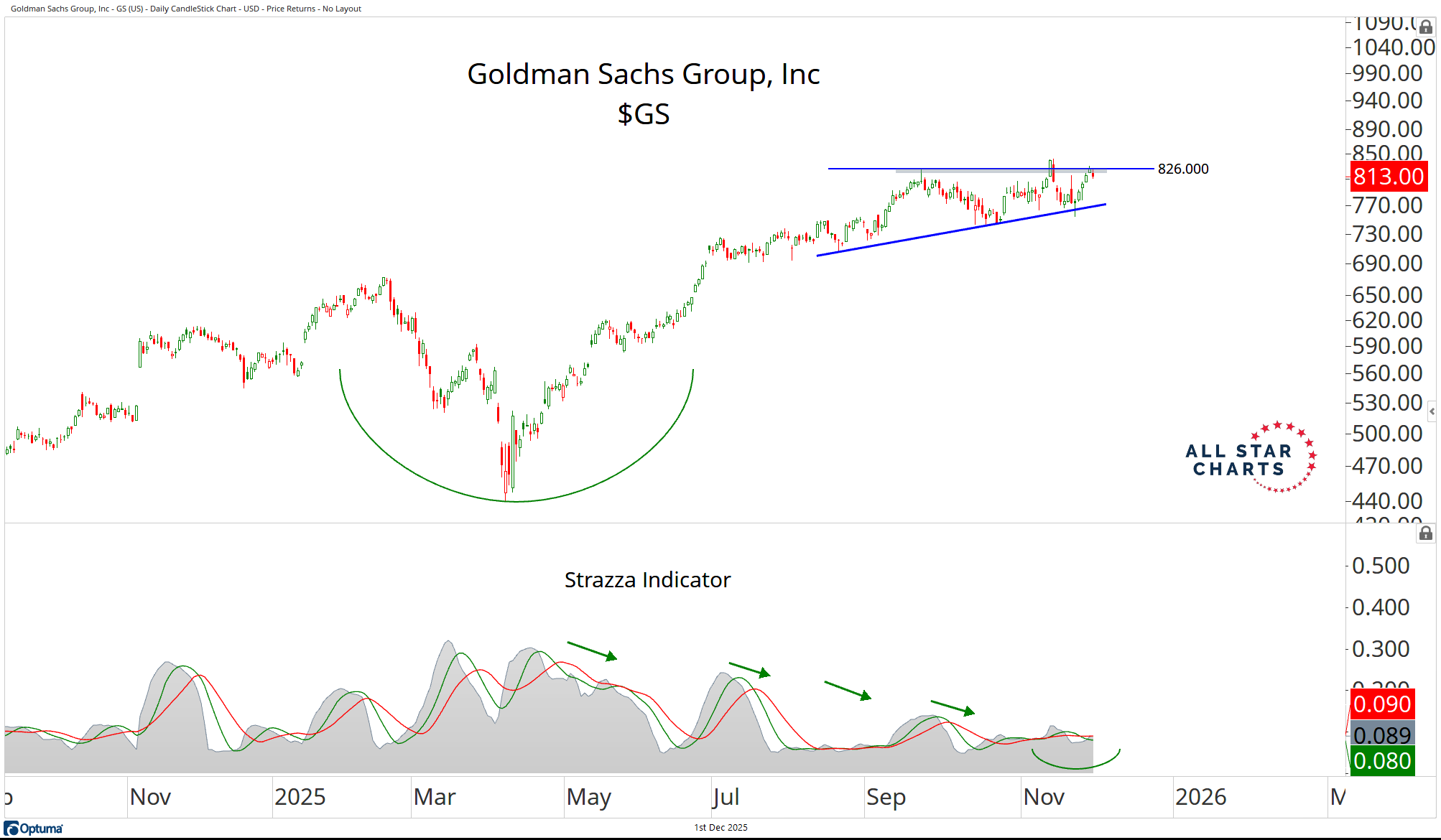 Squeeze Watch The Squeeze Watch (12/01/2025) December 1, 2025 Welcome to The Squeeze Watch.We’re very excited to present our Squeeze Engine, one of the main tools that powers the success of Breakout Multiplier.The financial sector is as important as they get when it comes to gauging the overall risk in equity markets. We like to think of them as a walking lie detector. Our standout today is a bellwether in this space and likewise the largest weighting in the Dow Jones Industrial Average. Here’s it is: Goldman Sachs $GS is currently exhibiting a Squeeze Score of 99.3 and a slightly tighter Long-Term Score of 99.4. Goldman Sachs is carving out a tight continuation pattern in the context of a primary uptrend. A breakout on strength above 826 would complete this pattern and spark the next wave higher. This would have positive implications for large-cap financials as well as the broader market. If you want access to our Squeeze Engine and our next financials trade, join Breakout Multiplier here, risk-free.- Breakout Multiplier Team More from Squeeze Watch The Squeeze Watch (11/28/2025) November 28, 2025 The Squeeze Watch (11/26/2025) November 26, 2025 The Squeeze Watch (11/25/2025) November 25, 2025 Catch Today’s Top BreakoutsSqueeze Watch delivers high-probability setups and breakout patterns across sectors — giving traders a daily advantage with data-driven opportunities. You must have JavaScript enabled to use this form. Email