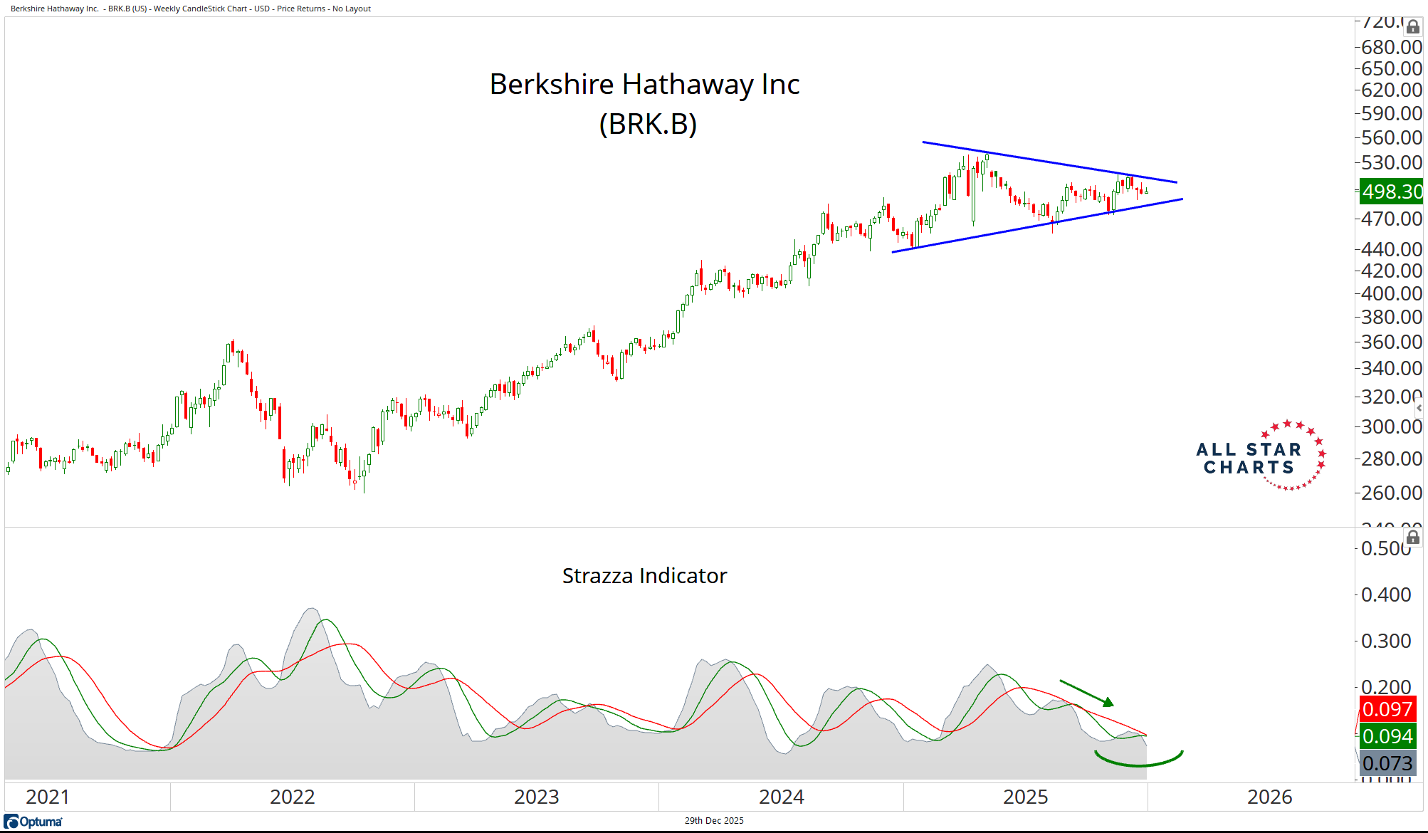 Berkshire Hathaway has been coiling in a range after entering a corrective phase following Warren Buffett’s retirement announcement earlier in 2025. Now, volatility on the Strazza Indicator is sitting at one-year lows.