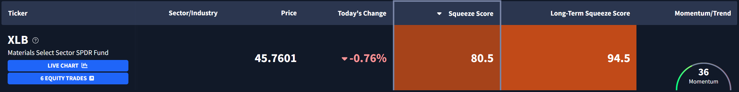 The Materials Sector $XLB is currently exhibiting a Long-Term Squeeze Score of 94.5.