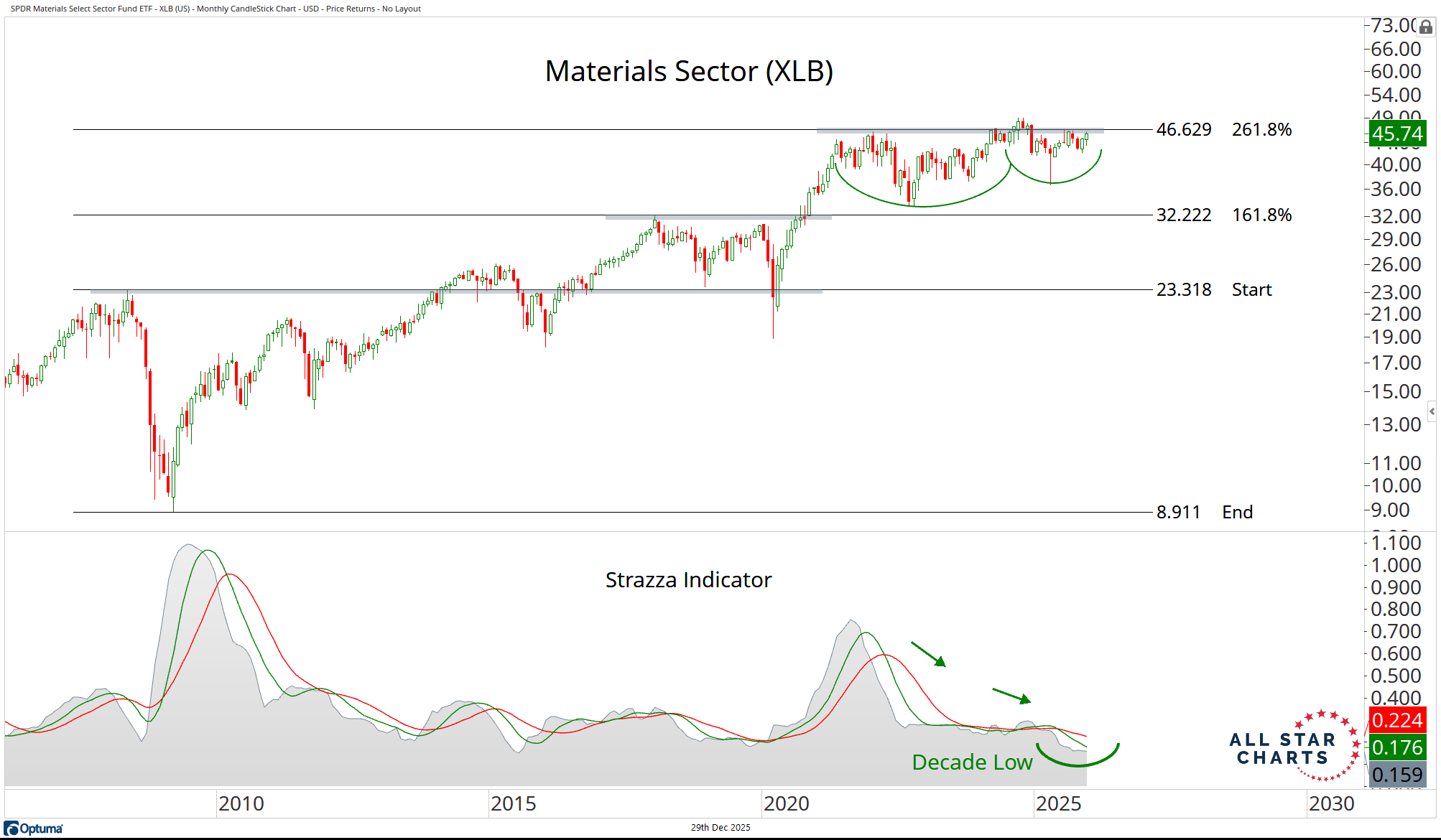 The large cap Materials space, largely dominated by chemicals rather than this year’s high-flying metals, is currently sitting at a decade-low volatility reading on the monthly Strazza Indicator.
