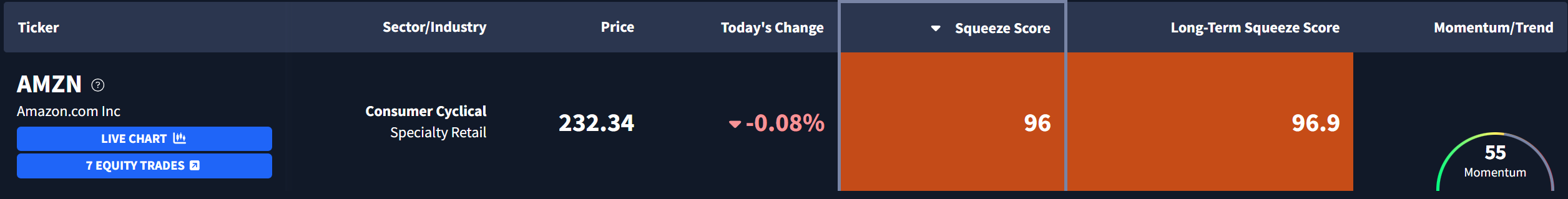 Amazon $AMZN is currently exhibiting a Squeeze Score of 96 and an even tighter Long-Term Score of 96.9.