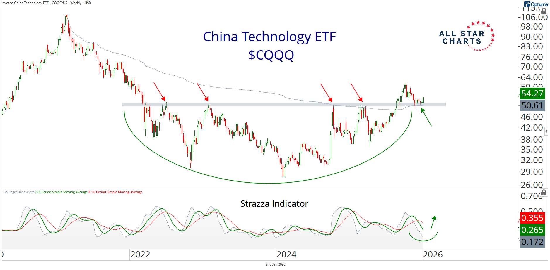 The Squeeze Watch (01/02/2026) January 2, 2026 Welcome to The Squeeze Watch.We’re very excited to present our Squeeze Engine, one of the main tools that powers the success of Breakout Multiplier.China has been locked in a corrective wave for months after a massive trend reversal completed last year.As we gear up for a new year, more and more evidence keeps stacking up offering a fresh opportunity for buyers to step in.Here’s today’s standout: China Technology ETF $CQQQ is currently exhibiting a Squeeze Score of 95.2 and an even tighter Long-Term Score of 96.2.Here’s what the chart looks like: Volatility on the Strazza Indicator is currently sitting near 2 year lows.Momentum has reset on a lot of the leading names, now looking to resume their explosive uptrends.We’ve traded this theme over the past year and a half, scoring some of our biggest winners ever.Today we locked in a 4X winner in our $BIDU calls — and we’ve already redeployed that capital into a fresh trade in $BABA…Want access to these trades? Join Breakout Multiplier and save 50% on an annual membership.- Breakout Multiplier Team Squeeze Watch More from Squeeze Watch The Squeeze Watch (01/05/2026) January 5, 2026 The Squeeze Watch (12/31/2025) December 30, 2025 The Squeeze Watch (12/30/2025) December 30, 2025 Catch Today’s Top BreakoutsSqueeze Watch delivers high-probability setups and breakout patterns across sectors — giving traders a daily advantage with data-driven opportunities. You must have JavaScript enabled to use this form. Email