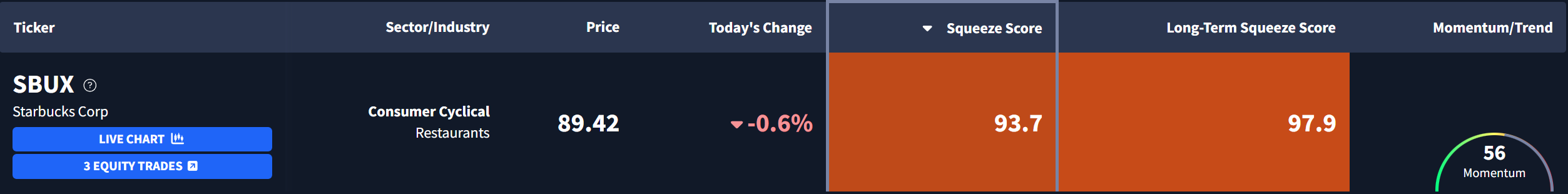 Starbucks $SBUX is currently exhibiting a Squeeze Score of 93.7 and an even tighter Long-Term Score of 97.9.