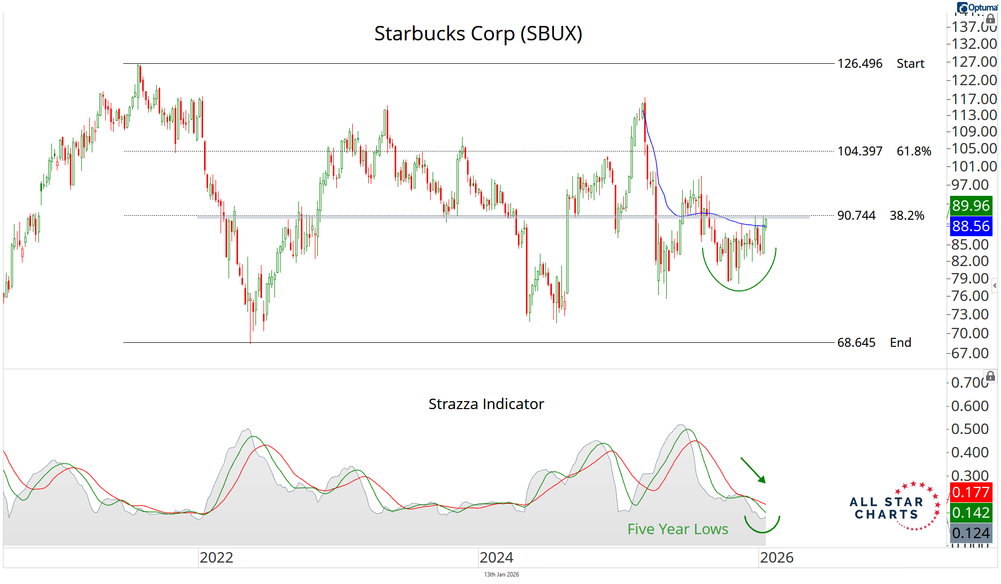 Instead, we’re looking at a rangebound stock in a clean bullish coil, with Strazza Indicator volatility compressed to five-year lows as Consumer Discretionary stocks begin to catch a bid again.