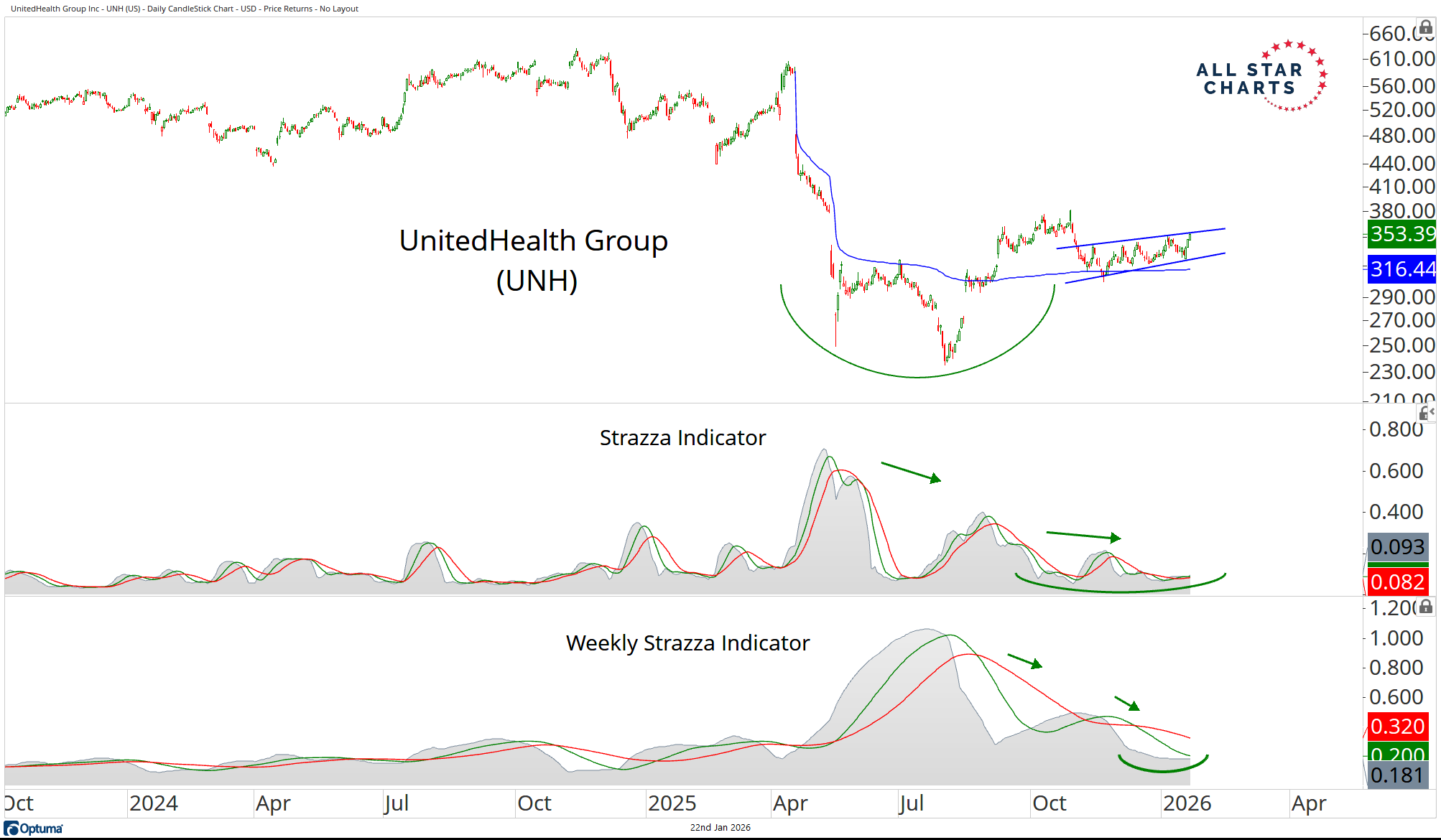 UNH is sitting at its lowest Strazza Indicator volatility reading since last year’s collapse. Multi-timeframe momentum compression is lining up with a clear attempt to reverse the trend.