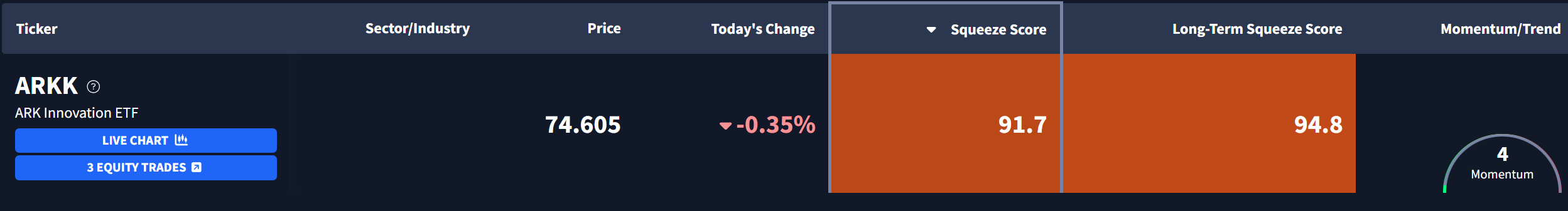 ARK Innovation ETF $ARKK is currently exhibiting a Squeeze Score of 91.7 and Long-Term Squeeze Score of 94.8.