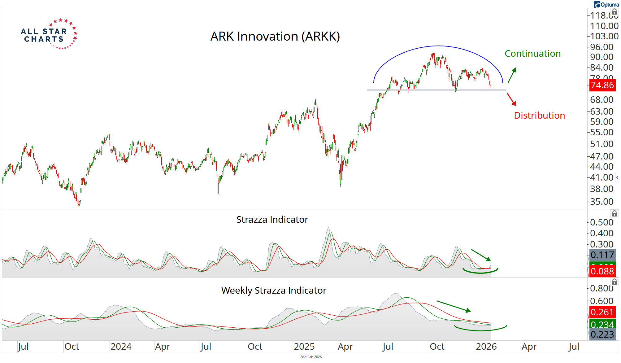 Volatility on the Strazza Indicator remains compressed on both the weekly and daily timeframes as price carves out what appears to be a distribution pattern.