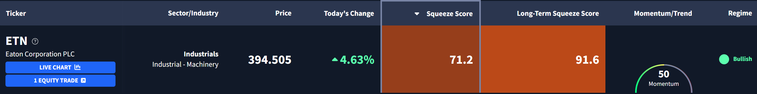 Eaton Corporation $ETN is currently exhibiting a Long-Term Squeeze Score of 91.60.