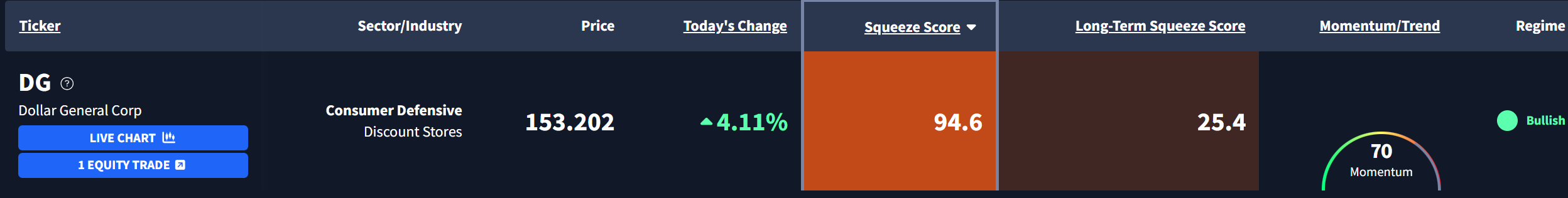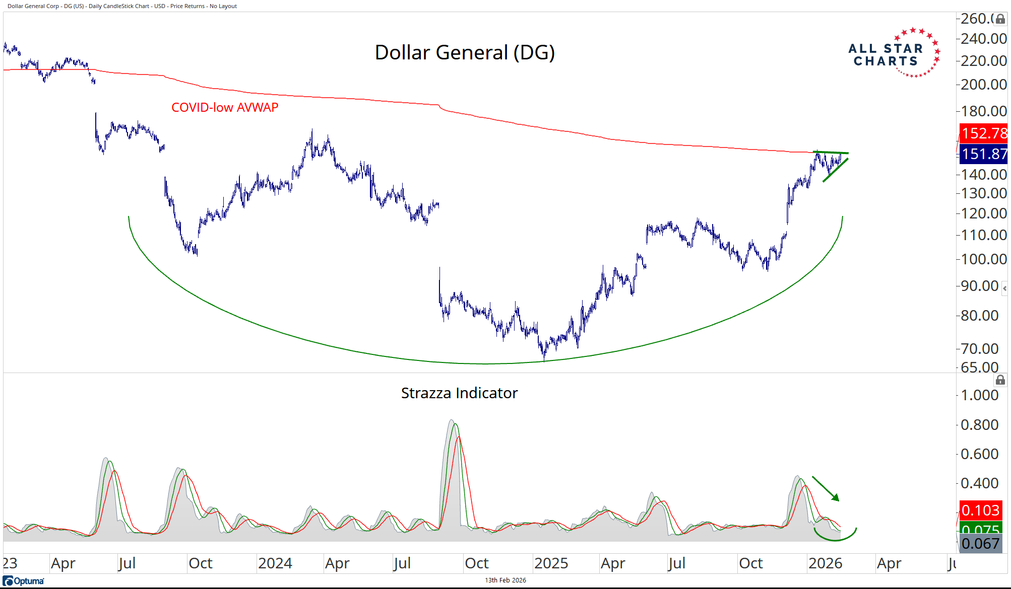The Squeeze Watch (02/13/2026) February 13, 2026 Welcome to The Squeeze Watch.We’re very excited to present our Squeeze Engine, one of the main tools that powers the success of Breakout Multiplier.Bifurcation continues, as the market punishes former leaders and lifts beaten-down laggards off the mat.Here’s today’s standout: Dollar General Corp $DG is currently exhibiting a Squeeze Score of 94.60. Here's what the chart looks like: DG is pushing higher out of a tight coil within the context of a massive trend reversal.Price is attempting to reclaim the VWAP anchored to the COVID lows, while volatility on the Strazza Indicator remains compressed near recent lows.If you want access to our Squeeze Engine and our next trade, join Breakout Multiplier here, risk-free.This is not a trade alert. - Breakout Multiplier Team Squeeze Watch More from Squeeze Watch The Squeeze Watch (02/12/2026) February 12, 2026 The Squeeze Watch (02/11/2026) February 11, 2026 The Squeeze Watch (02/10/2026) February 10, 2026 Catch Today’s Top BreakoutsSqueeze Watch delivers high-probability setups and breakout patterns across sectors — giving traders a daily advantage with data-driven opportunities. You must have JavaScript enabled to use this form. Email More from Breakout Multiplier The Open Bar Watch Now Breakout Multiplier Join Today