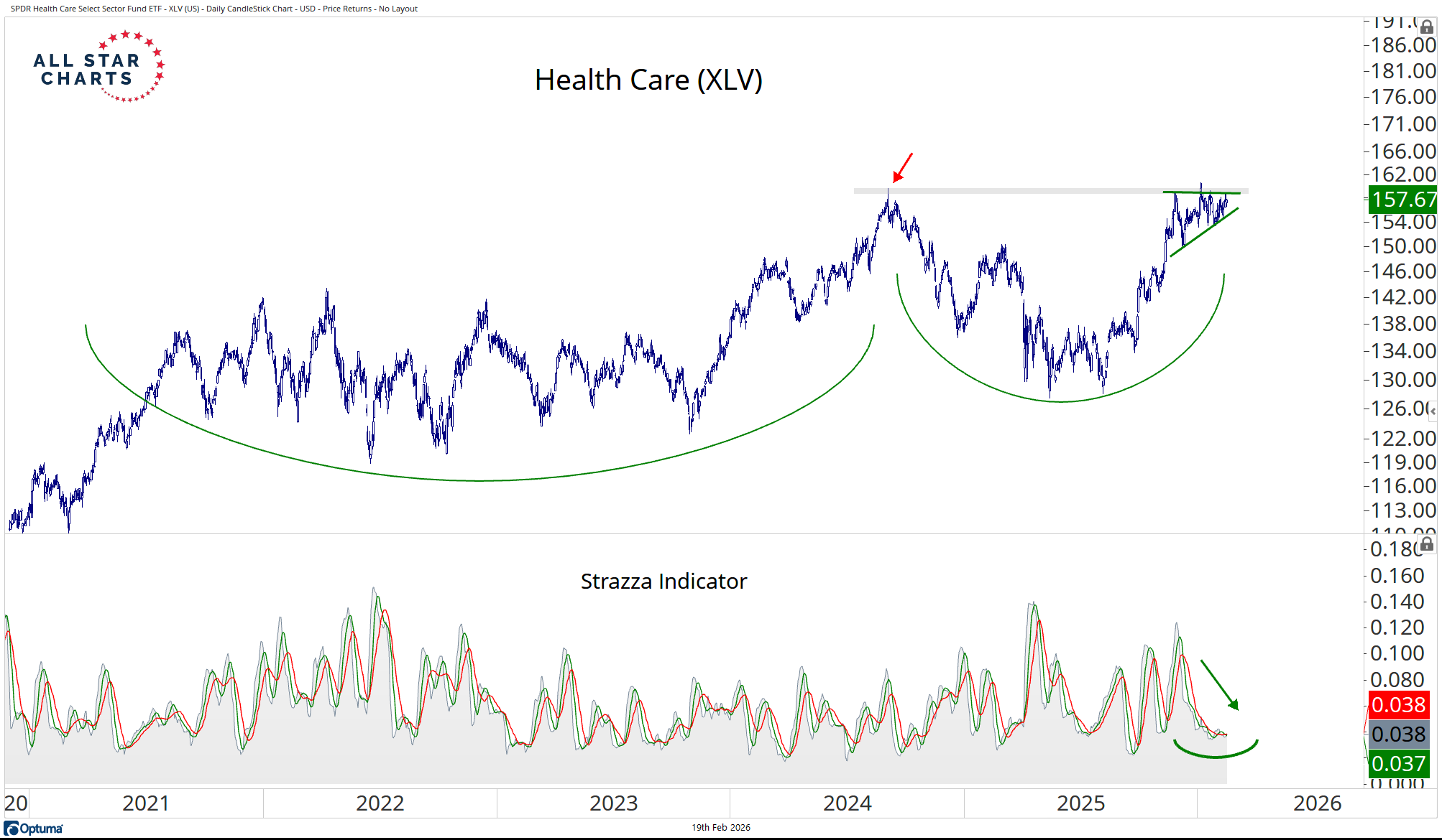 The Health Care sector is coiled in a tight pennant at the upper bound of a multi-year base-on-base pattern.