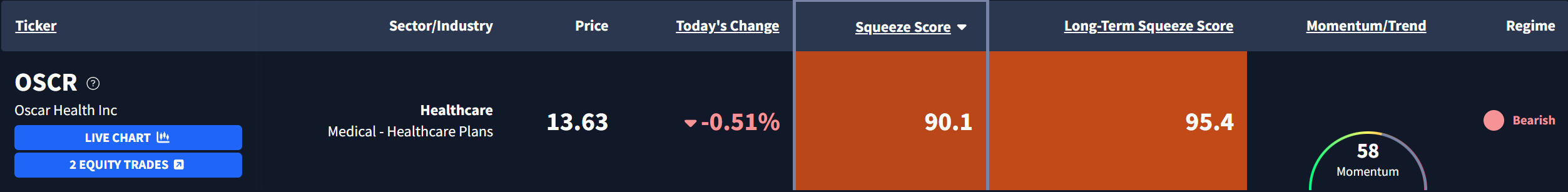 Oscar Health $OSCR is currently exhibiting a Squeeze Score of 90.1 and an even tighter Long-Term Squeeze Score of 95.4.