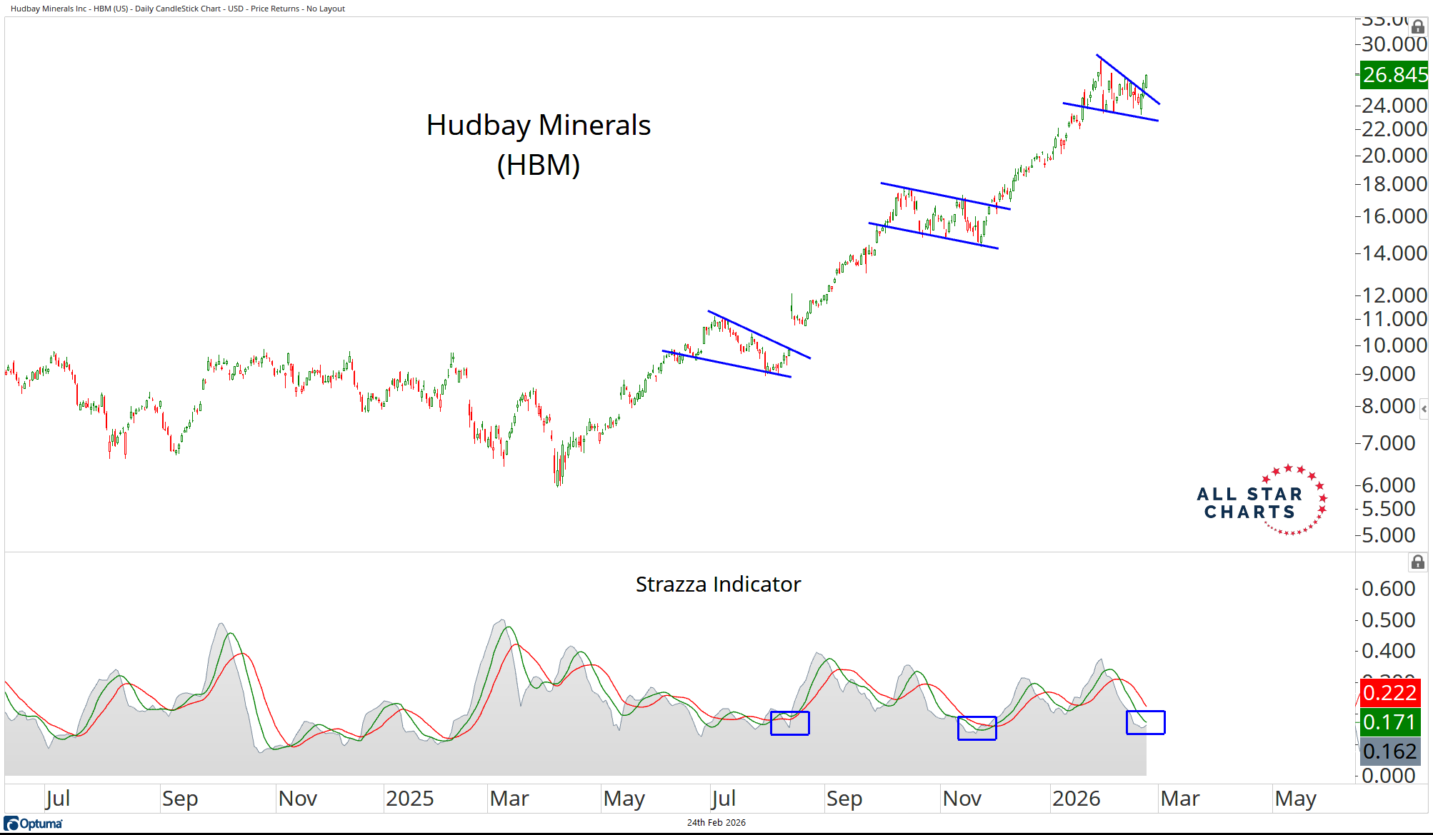 Notice how volatility compresses on the Strazza Indicator during each consolidation phase along the stair-step higher, only to expand again as the stock resolves to the upside.