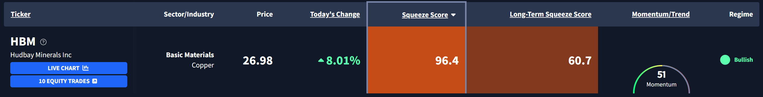 Hudbay Minerals Inc $HBM is currently exhibiting a Squeeze Score of 96.4.