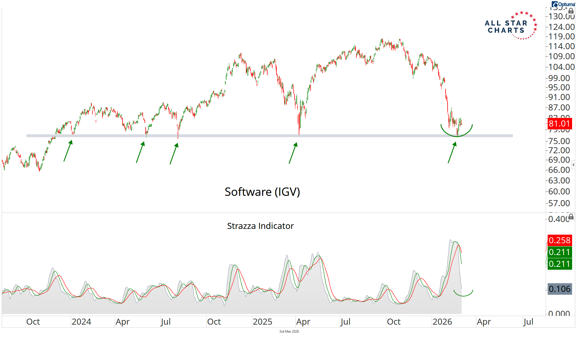 Volatility on the Strazza Indicator has compressed on $IGV as the group finds support at a polarity level that has held for the past two years.