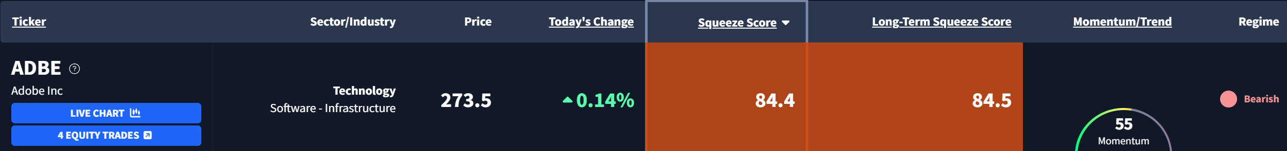 Adobe Corp $ADBE is currently exhibiting a Squeeze Score of 84.4.