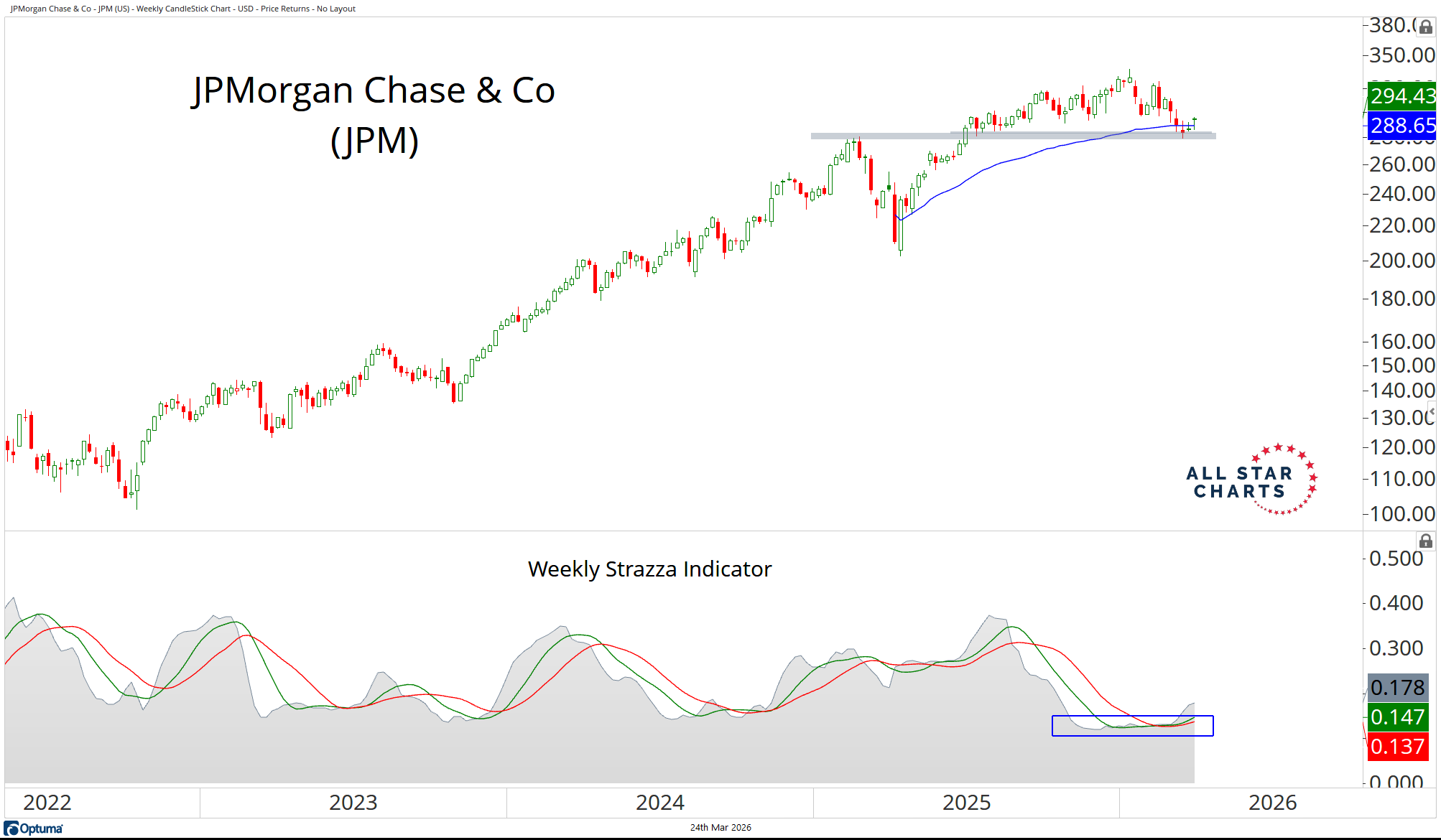 JPM is coiled, with the tightest weekly Strazza Indicator volatility in over a year.