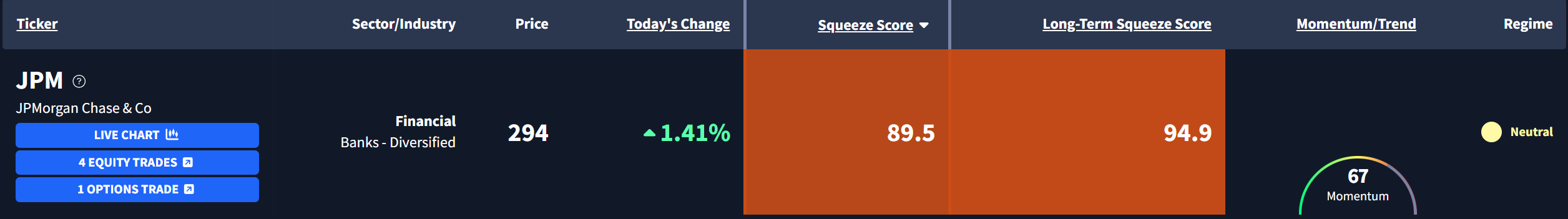 JPMorgan Chase & Co. $JPM is currently exhibiting a Long-Term Squeeze Score of 94.9.