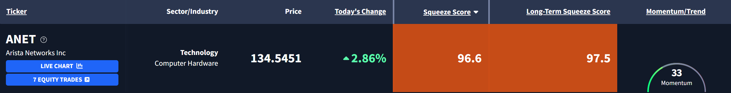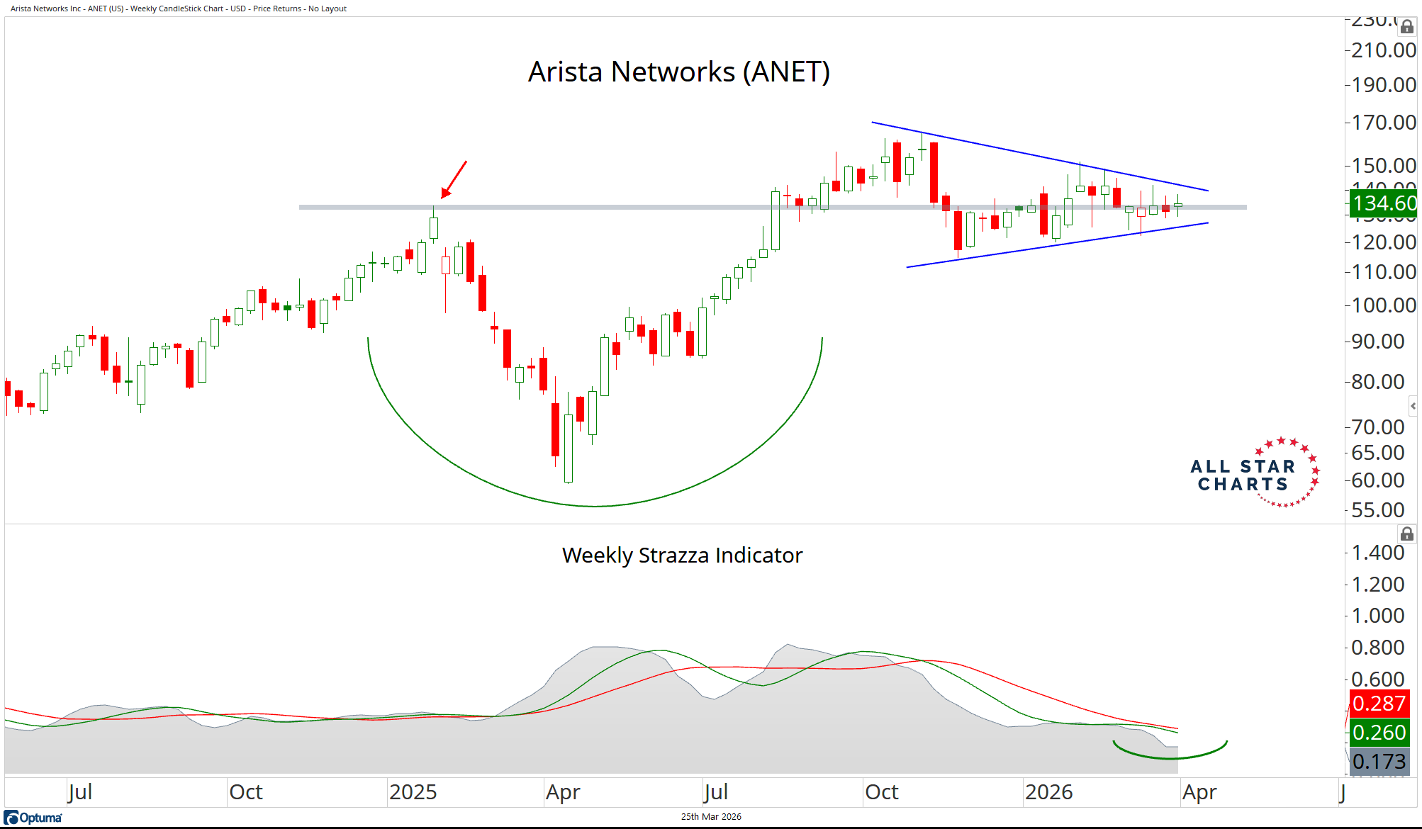 The Squeeze Watch (03/25/2026) March 25, 2026 Welcome to The Squeeze Watch.Here's today's standout. Arista Networks $ANET is currently exhibiting a Squeeze Score of 96.60 and an even tighter Long-Term Squeeze Score of 97.5.Here's what the chart looks like: ANET is coiled in a symmetrical triangle against the pre-tariff selloff highs, with the all-time high AVWAP also coming in around the same level.As long as price holds above this polarity confluence, the path of least resistance remains higher. Below it, and the bears can press their advantage.Volatility on the Weekly Strazza Indicator is compressed to multi-year lows, signaling that momentum has fully reset ahead of the next major move.If you want access to our Squeeze Engine and our next trade, join Breakout Multiplier here, risk-free.- Breakout Multiplier Team Squeeze Watch More from Squeeze Watch The Squeeze Watch (03/26/2026) March 26, 2026 The Squeeze Watch (03/24/2026) March 24, 2026 The Squeeze Watch (03/23/2026) March 23, 2026 Catch Today’s Top BreakoutsSqueeze Watch delivers high-probability setups and breakout patterns across sectors — giving traders a daily advantage with data-driven opportunities. You must have JavaScript enabled to use this form. Email More from Breakout Multiplier The Open Bar Watch Now Breakout Multiplier Join Today