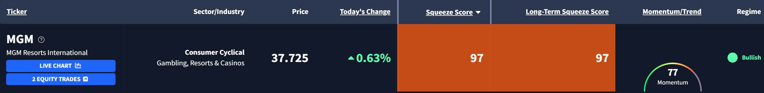 The Squeeze Watch (03/26/2026) March 26, 2026 Welcome to The Squeeze Watch.Here's today's standout. MGM Resorts International $MGM is currently exhibiting a Squeeze Score of 97 and a Long-Term Squeeze Score of 97. Here's what the chart looks like: MGM is coiled in a tight base, with price pressing against a key AVWAP anchored to the prior cycle high.Volatility is compressed across multiple timeframes, signaling a full momentum reset.A breakout above that AVWAP near 38 could spark an explosive rally.If you want access to our Squeeze Engine and our next trade, join Breakout Multiplier here, risk-free.- Breakout Multiplier Team Squeeze Watch More from Squeeze Watch The Squeeze Watch (03/25/2026) March 25, 2026 The Squeeze Watch (03/24/2026) March 24, 2026 The Squeeze Watch (03/23/2026) March 23, 2026 Catch Today’s Top BreakoutsSqueeze Watch delivers high-probability setups and breakout patterns across sectors — giving traders a daily advantage with data-driven opportunities. You must have JavaScript enabled to use this form. Email More from Breakout Multiplier The Open Bar Watch Now Breakout Multiplier Join Today