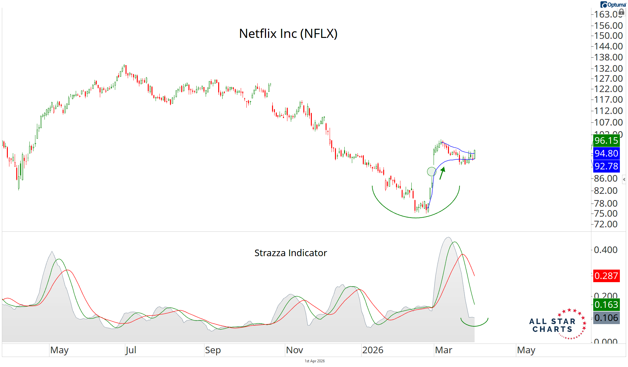 The stock is currently pinned in an anchored VWAP pinch, while volatility on the Strazza Indicator has contracted aggressively and is now sitting near multi-month lows.